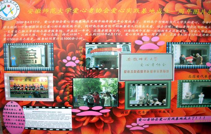 4月17日,时值芜湖“福寿园老年公寓”爱心实践基地成立一周年之际,公司爱心者协会精心设计、组织开展了庆祝爱心实践基地建设一周年活动大型图片成果展,在有形展示爱协志愿活动成果的同时,更向广大同学进行了一场爱心教育,并有效推进了爱协志愿者招募工程。