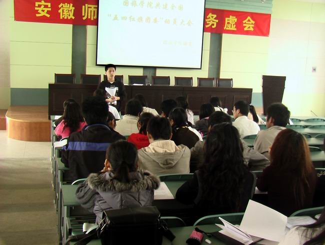 312国旅公司团委在院实验楼101教室召开了“共建全国五四红旗团委”动员大会,全院各班团支部干部同学参加了此次动员大会。