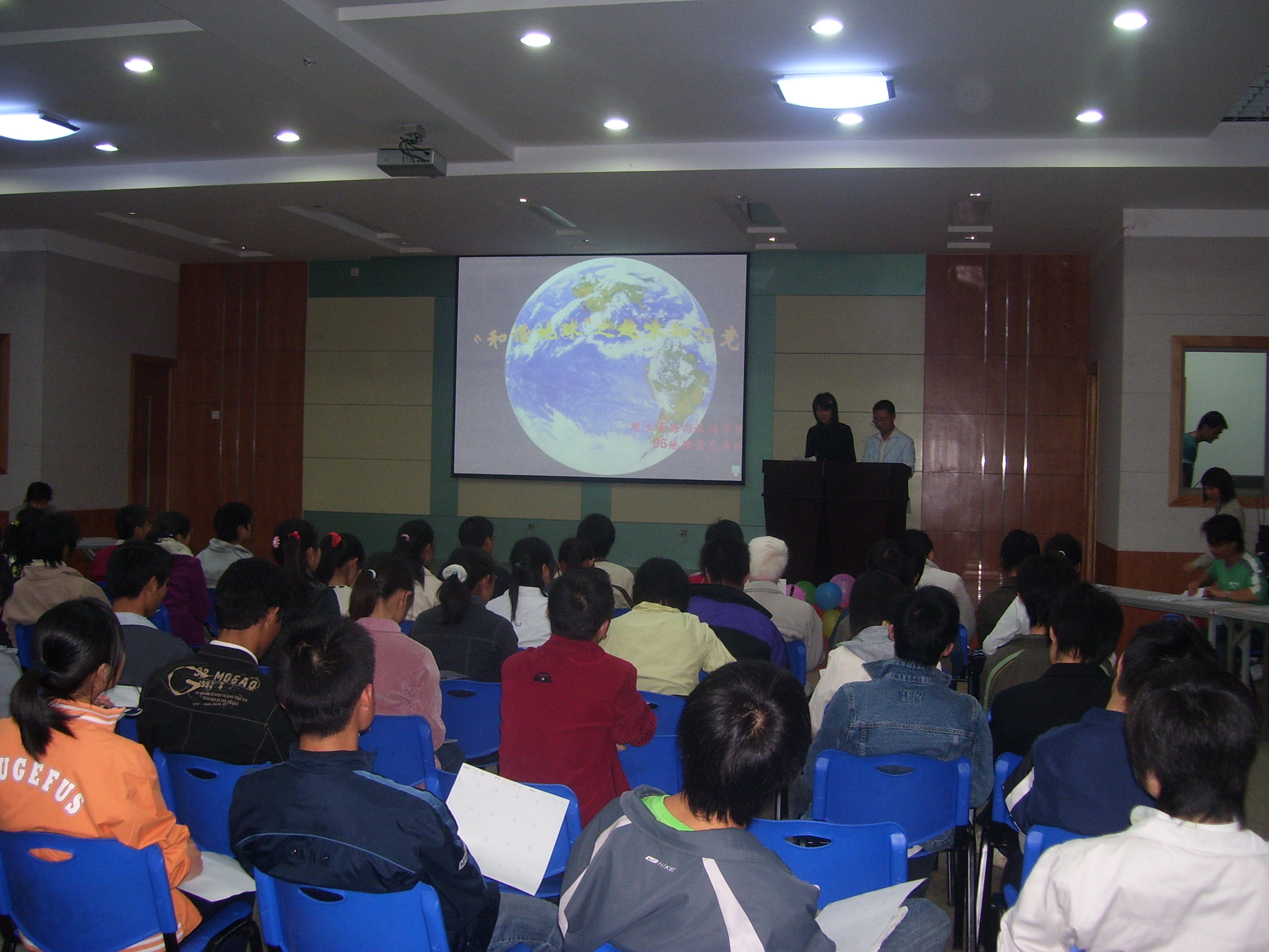 4月22日晚6:30,以“和谐地球”为主题的趣味知识竞赛在国旅公司实验楼多媒体教室举行。近百名选手和观众济济一堂,比赛在热烈友好的气氛中进行。本次比赛采取分轮淘汰制,在经过了两轮判断题,六轮选择题和一轮加试题之后,场上最终剩下十名选手进入最后一轮论述题的角逐。经过两个小时的紧张比赛最终决出了一,二,三等奖及优秀奖若干。