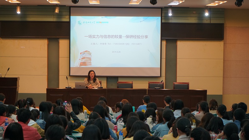 作为一名考研至南大的学子,高润艺向同学们介绍了中国研究生招生信息网的网址,她从公共课、专业课、时间节点、心灵鸡汤四个方面展开,推荐各科优秀的视频课和参考书,并鼓励同学们在考研过程中拥有一个良好的心态。秦琳分享自己备考矿大时认真复习英语、政治、专业课的过程,针对各科介绍了参考资料和几位优秀的老师,她特别强调了择校、英语和心态的在考研过程中所占据的重要地位。考研至华师大的李国琼则详细介绍其关于考研各科的经验与心得,她认为,一定不能被别人的进度打乱,要注意多看零碎知识,始终坚持制定计划。谭雅文最后提到,考研过程中应学会舍得,注意安排好考研的三个时间段,她鼓励同学们一直坚持下去,要“做自己,既不好高骛远也不妄自菲薄”。