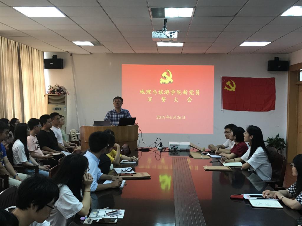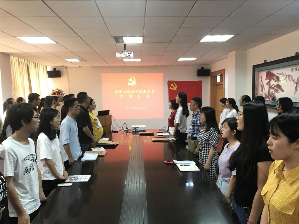 仪式开始,全体起立奏唱国歌。赵冬梅宣读了党委《关于同意罗勇等55名同志发展为中共预备党员的通知》; 对55名新党员按支部发放了党徽和党费证;由陈祥云领誓,新党员进行了入党宣誓、老党员重温了入党誓词;2017级旅游管理专业吴燕燕代表新党员向党组织作出庄严承诺;2016级城乡规划专业朱林妹代表老党员向新党员分享了她的体会,鼓励新党员坚定理想信念,勤奋刻苦学习,发挥模范作用,勤于躬身实践,坚定信仰,用实际行动践行今日誓言。