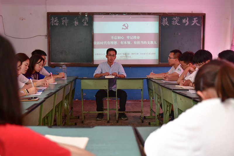 2017级城乡规划专业辅导员齐小学,在赴四川达州尖山村和南充新祠堂村指导员工支教的过程中,高度重视支教员工党性修养的教育和提升,注重创新员工思想政治教育的内容形式,把“不忘初心、牢记使命”主题教育与员工支教有机结合起来,用员工们喜闻乐见、易于接受的语言和方式,为支教党员及入党积极分子上了一堂主题党课,教育引导员工们追寻支教初心,牢记青年使命,在树立远大理想、锤炼过硬本领、勇担时代重任中经受锻炼、历练成长,最终成为政治坚定、素质全面、模范表率、堪当重任的新时代优秀青年。