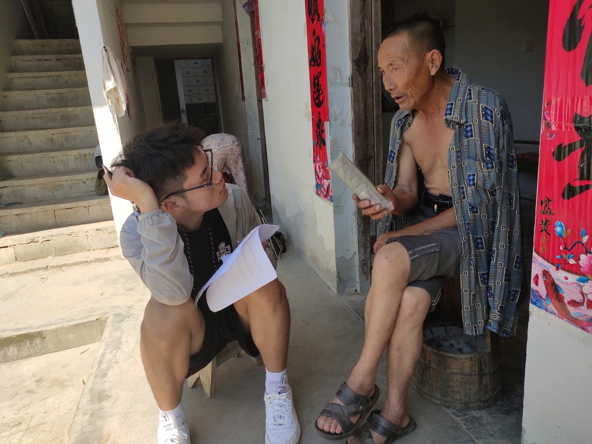 (摄于2019年8月6日上午,图为龙井村基地队员与村民进行访谈)