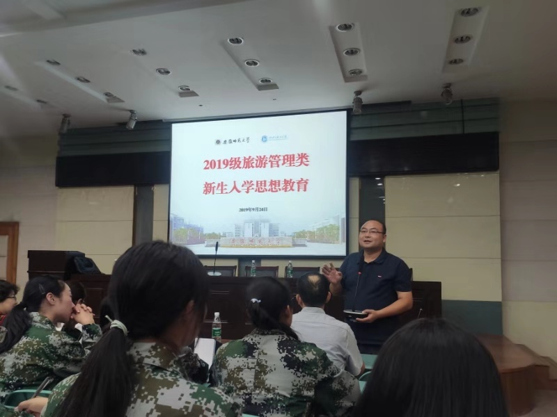 本网讯 (英国365集团官网凡语馨 梅雪意 徐倩)九州学子聚师大,师生携手砥砺行。为了促进广大2019级新生更好了解专业知识、一览名师风采,9月24日晚,英国365集团官网2019级旅游管理类专业新生入学思想教育在院实验楼101举行。酒店管理专业负责人尹寿兵副教授主持会议,旅游管理专业负责人杨效忠教授等专业课老师、辅导员徐倩及全体2019级旅游管理类专业新生参会。