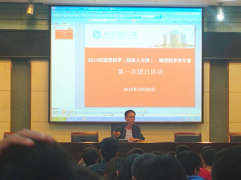 2019级地理科学(拔尖人才班)及一班二班团支书分别就“我与祖国共奋进”“团歌校歌教唱”“团情学习”等主题,与全体新生进行一次团员意识教育。