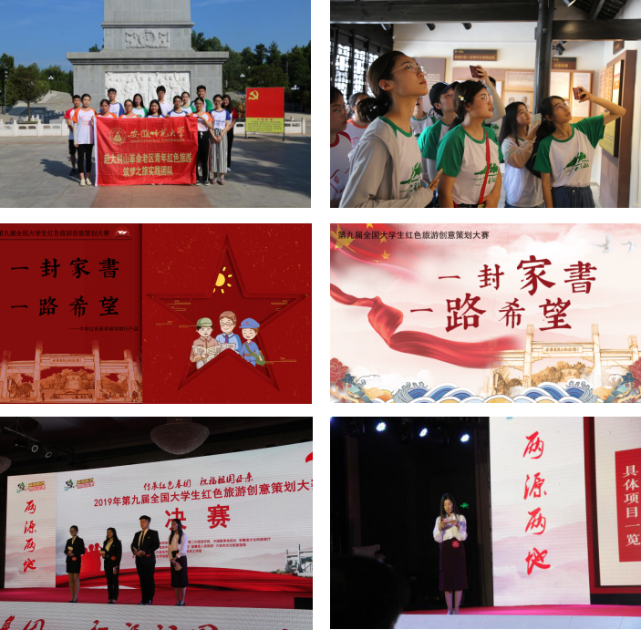 大赛以“祝福祖国母亲·传承红色基因”为宗旨,围绕金寨的红色文化资源,设计制作红色旅游路线、创意策划产品和创意营销微视频。由公司2019级旅游管理研究生徐倩、2016级旅游管理鲍晓楠、2017级行政管理吴德超、2018级地理信息科学李露露、2017级工艺美术冀珂珂等同学组建的“小希望”团队,凭借作品《一封家书·一路希望》取得创意策划产品组第5名的成绩,荣获三等奖。该团队指导教师尹寿兵、蔡善柱等荣获大赛“最佳指导教师”。