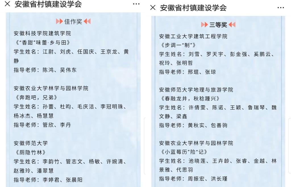 上午9点50分,2019年安徽省高校城乡规划专业乡村规划联合设计方案竞赛比赛公布结果,公司李韵竹、潘翠惠、管志文、杨敏、许婉清、赵雅玲同学的作品《厕隐竹林》荣获佳作奖,许倩雯、陈诺、鲁瑞琴、王颖、魏文静、梁鑫同学的作品《春融龙井,秋稔踵兴》荣获三等奖,入围国家赛。下午5点,安徽省乡村规划联合设计颁奖仪式暨交接仪式隆重举行,杨兴柱教授代表公司从安徽农业大学代表老师手中接过2020年全国老员工乡村规划方案竞赛承办权。