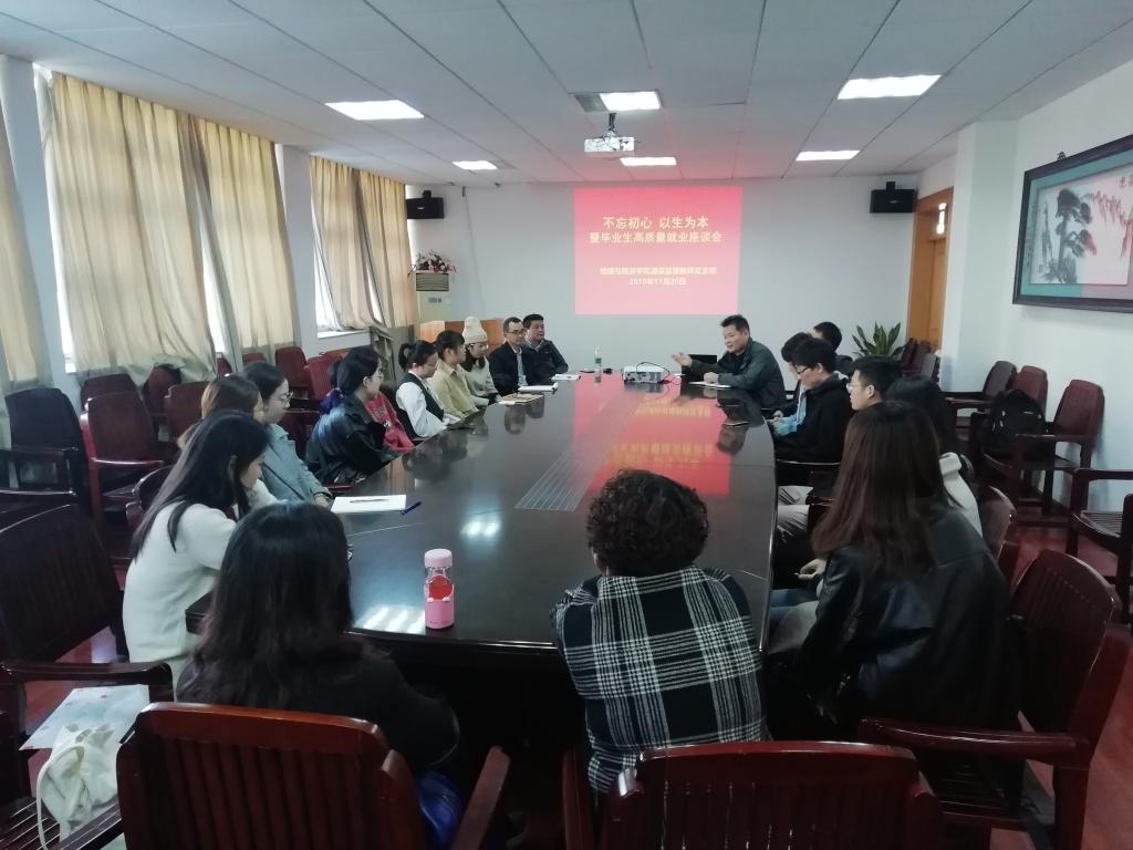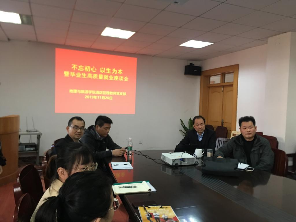 本网讯(地理公司张伟 陈健)为深入贯彻“不忘初心牢记使命”主题教育精神,英国365集团官网酒店管理专业教师党支部认真组织支部党员同志开展讨论和学习,坚持以立德树人为目标,以做“四有”好老师,当好“四个引路人”为重点,聚焦问题抓落实,于近日召开了“不忘初心·以生为本”暨2020届酒店管理专业毕业生高质量就业座谈会。公司党委副书记乔静,全体酒店管理党员教师和毕业生参会。会议由党员教师张伟主持。
