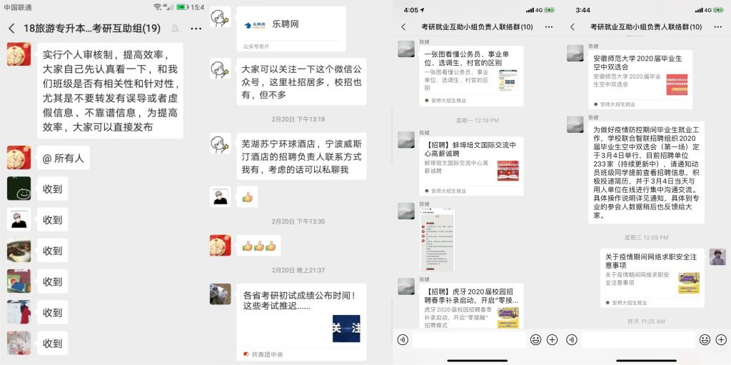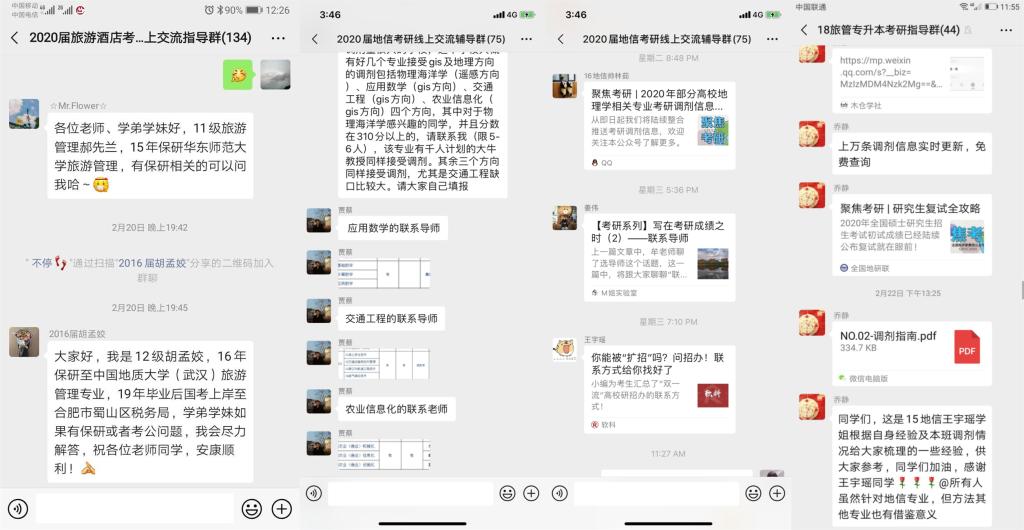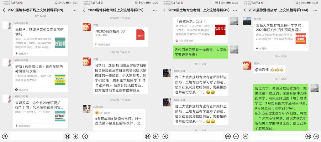 2月16日,各专业分别建立考研复试调剂线上交流辅导群,邀请公司领导、各专业负责人、专业教师、优秀员工等进群与考研员工进行线上交流,为考研员工复试、调剂答疑解惑,提供宝贵建议。全院各专业在班子成员、专业负责人和广大教师的积极参与下,针对复试中的专业备考要点、面试注意事项和调剂方法策略等耐心细致给予员工指导解答,发挥各自资源专长主动为学子提供“一对一”精准帮扶,如:地理信息科学专业程先富教授、城乡规划专业姚景艳老师等定期给员工发布复试调剂信息,地理科学专业吴立教授、地理信息科学专业贾蔡老师等主动发挥人脉资源积极向兰州大学、西北大学、合肥工业大学等高校推荐考生。公司往届优秀考研学子在总结自身考研、调剂经历的基础上,撰写考研复试感悟为母院学弟学妹做经验分享,充分发挥员工资源在促进考研中的有效作用。