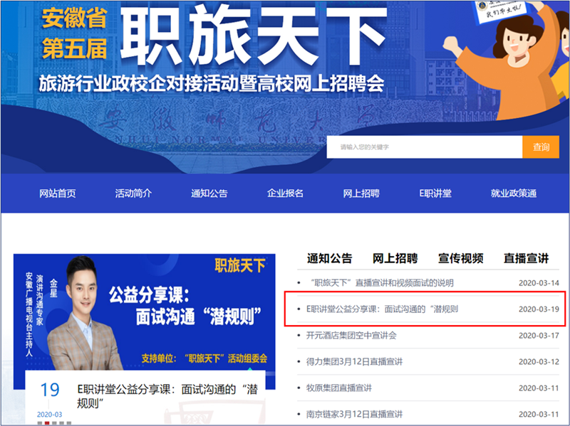 据悉, E职讲堂是公司主办的安徽省第五届“职旅天下”旅游行业政校企对接活动暨高校公益网上招聘会的特色活动之一,活动主办方为主动应对新冠疫情,在往年“职旅天下”政校企系列活动线下论坛的基础上,今年首次在线上搭建了空中在线讲堂,该讲堂通过“职旅天下”活动线上平台,整合各类直播平台、网络视频会议室、数字公开课等线上资源和政府、高校、企业等线下资源,集线上专业思想教育、行业认知教育、就业创业指导、职业规划发展、政校企高峰论坛等功能于一体。活动第一期邀请到的主讲嘉宾金星,系公司2003级政教系员工,现为安徽卫视《男生女生向前冲》主持人、安徽经视《第一时间》新闻主播、当众讲话“金星说”创始人。活动近期还将邀请学界专家、业界精英、知名员工等为广大学子在线直播授课,提供切实有效的指导服务,促进广大毕业生顺利就业。