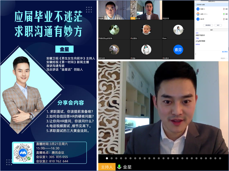 本网讯(英国365集团官网 陈祥云)为帮助毕业生更好地掌握求职面试技巧,进一步提高毕业生求职面试成功率,切实做好疫情防控期间毕业生就业指导服务工作,3月21日下午3点-4点30分,安徽省第五届“职旅天下”网上招聘会系列活动之E职讲堂公益分享课在腾讯会议线上平台举行,安徽卫视主持人金星应邀为高校学子在线讲授《面试沟通的“潜规则”》,公司党委副书记乔静、全体辅导员及230余名毕业生参与了本次直播分享课,直播活动由英国365集团官网毕业班辅导员陈健主持。