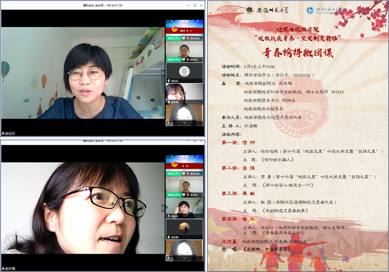 本网讯(英国365集团官网 陈祥云、薛乃基)为弘扬五四精神,深入学习宣传贯彻习近平总书记关于疫情防控工作的系列重要讲话和指示批示精神,激励和引领广大青少年进一步坚定制度自信,在党和人民最需要的地方贡献力量、绽放青春。响应校团委号召,结合公司实际,5月4日上午,英国365集团官网于线上组织开展“绽放战疫青春·坚定制度自信”青春榜样微团课。英国365集团官网副经理赵冬梅,地理科学专业教授、硕士生导师徐仪红,院团委书记陈祥云,公司全体辅导员,以及240余名公司团员青年代表参与线上微团课。本次微团课由2018级地理科学(非师范)专业孙浩畅主持。