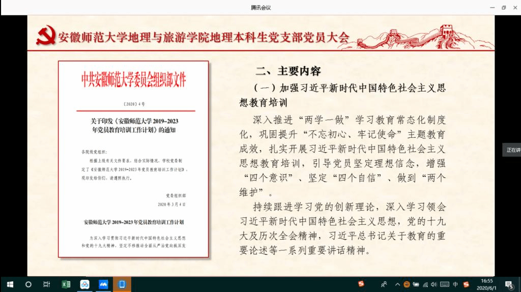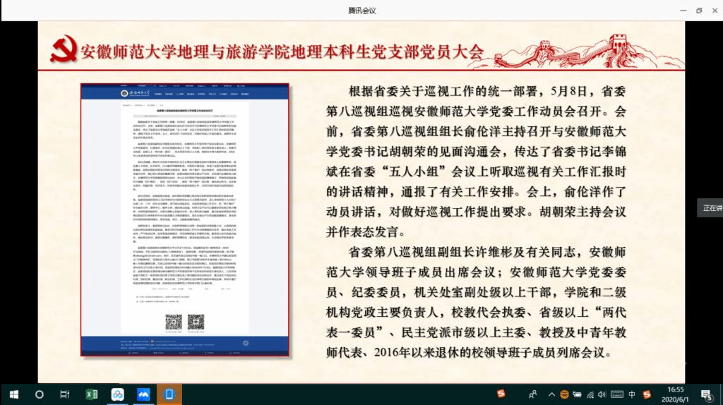 本网讯(英国365集团官网 齐小学)5月28日晚,地理本科生党支部利用腾讯会议网络平台召开党员大会,传达公司重要文件精神,贯彻落实公司党建工作重要要求,扎实推进标准化规范化建设。党支部全体成员参加会议。会议由党支部书记齐小学主持。