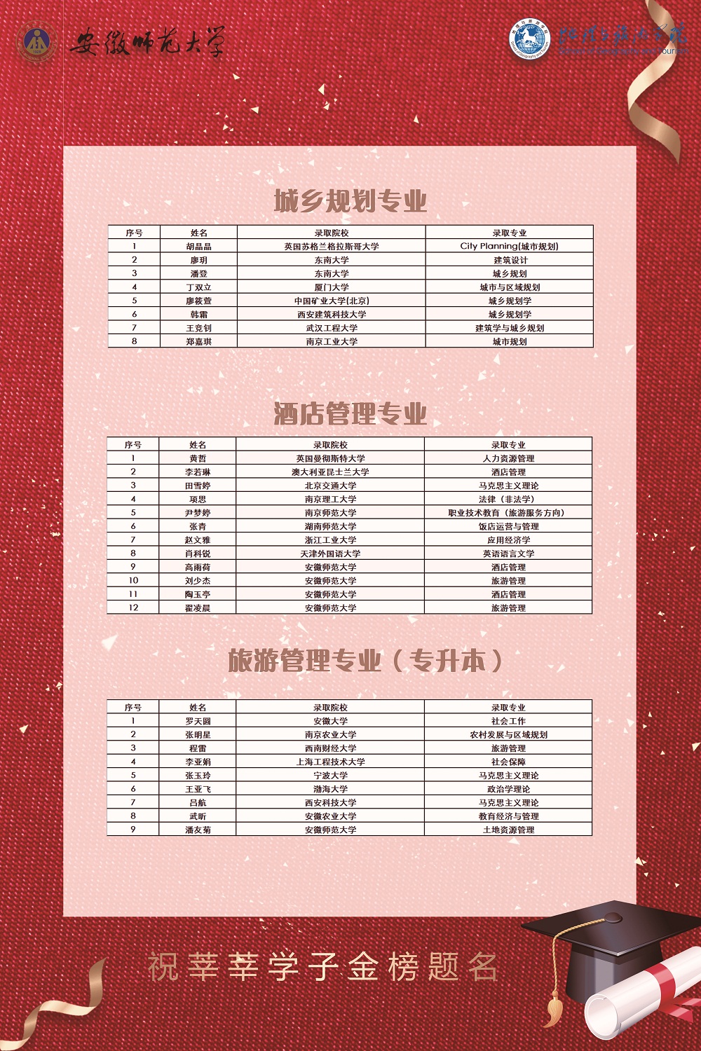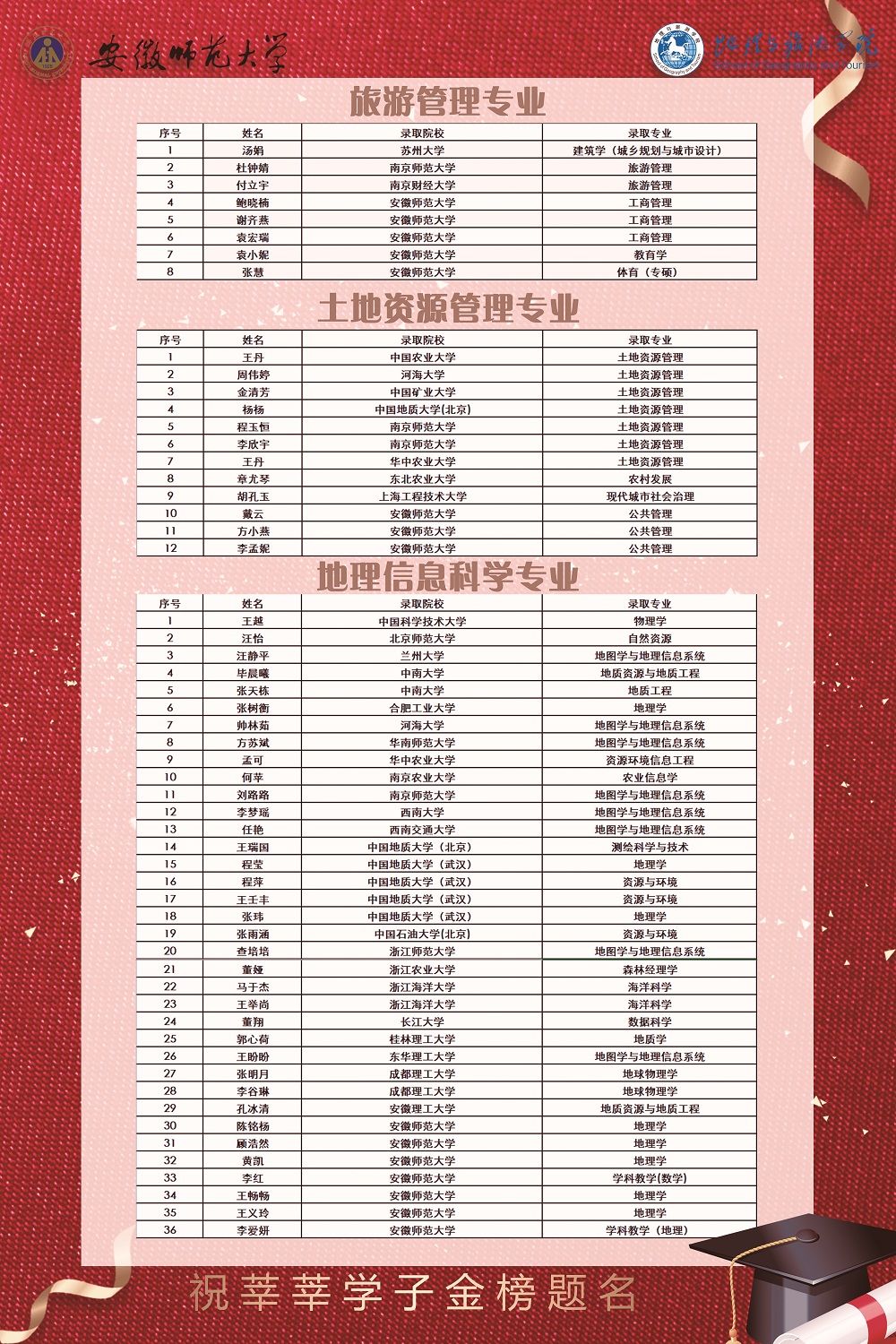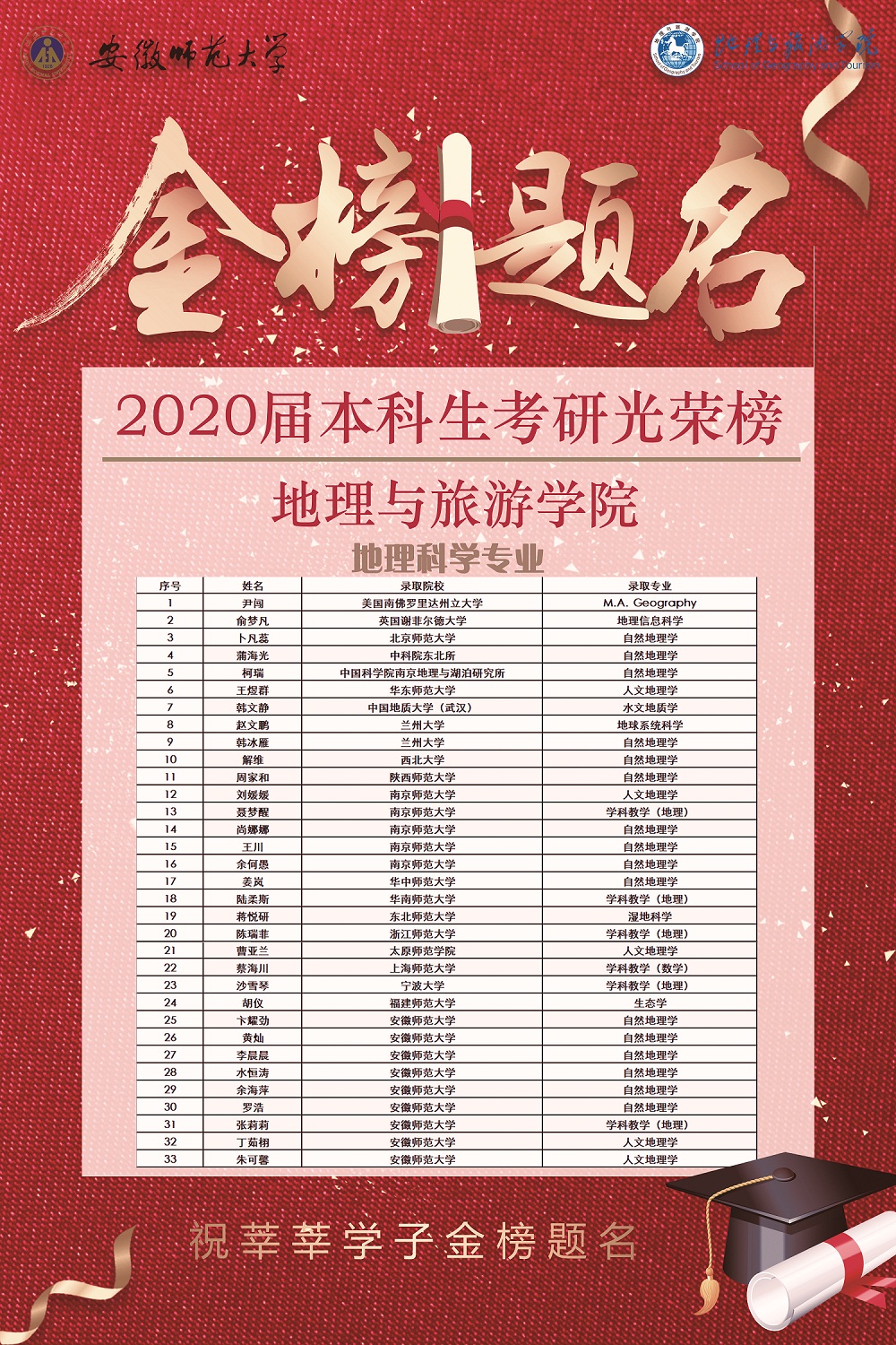 英国365集团官网2020届毕业生共459人,国内外继续深造人数达119人,占毕业生总人数的25.93%。各专业升研率分别为地理科学专业38.64%、旅游管理专业10.96%、土地资源管理专业26.67%、地理信息科学专业51.43%、城乡规划专业22.22%、酒店管理专业23.08%,旅游管理(专升本)11.25%。其中考取国内双一流高校、科研院所和出国深造人数占总数的53.78%;国内主要包括中国科学技术大学、东南大学、厦门大学、北京师范大学、华东师范大学以及中国科公司等高校和科研院所;国外主要有美国佛罗里达州立大学、英国谢菲尔德大学、英国格拉斯哥大学、英国曼彻斯特大学、澳大利亚昆士兰大学等。