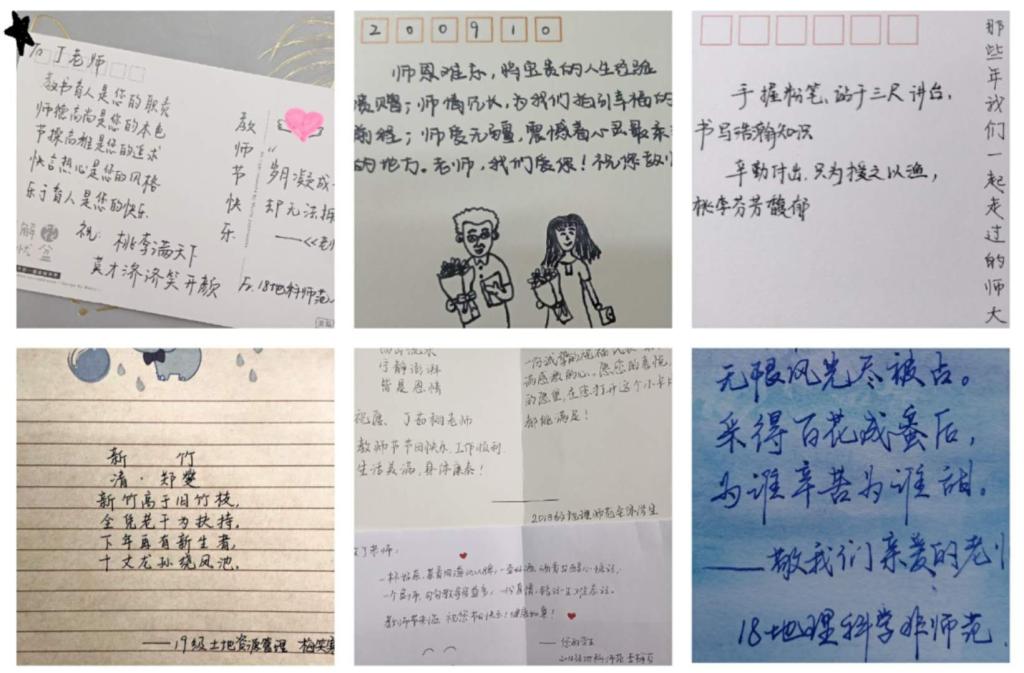 三尺讲台贯春秋,谨以诗文诉师恩。教师节前夕,各班开展了“以诗文 诉师恩”主题征文活动,同学们纷纷踊跃参加用自己或质朴或优美的文字将对老师的感恩之心诉诸笔端。教师节当天同学们将自己的原创诗歌誊写在自制贺卡上,献给一直辛勤付出的老师们,表达自己对老师最深厚的感激和祝福。