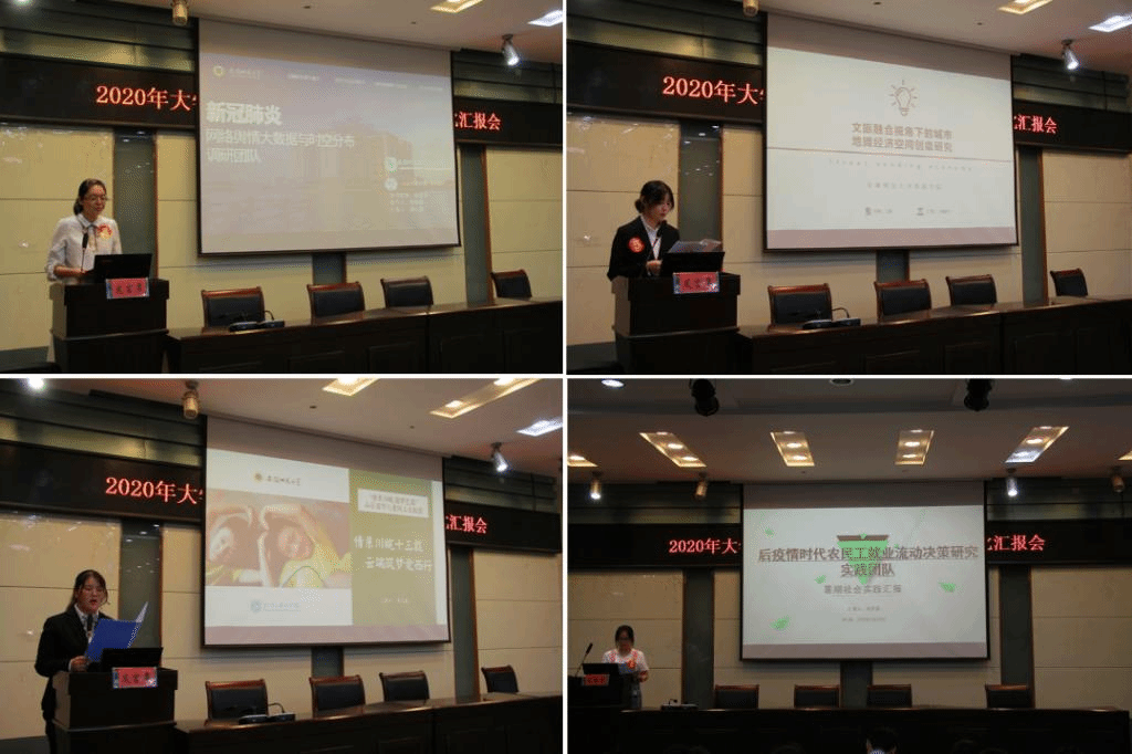 参加本次评比汇报会有来自2018级、2019级各专业的8支重点团队、7个班级团支部共15组队伍。各团支部或团队汇报人流畅的汇报演讲结合图文并茂的PPT展示,从整体概况、实践内容、成果展示、心得体会等方面进行汇报。生动形象地汇报了实践学子们暑期实践的参与情况和收获感悟,为评委老师和同学们展现了一幅五彩纷呈的暑期实践画卷。