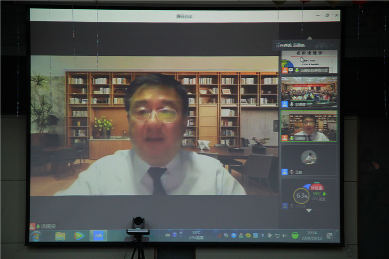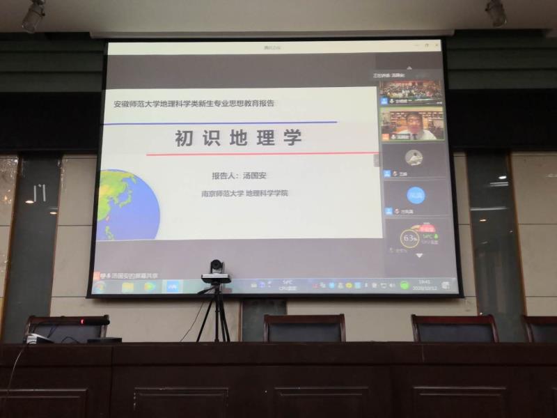 本网讯(英国365集团官网 洪茹芊 韩红豆)为进一步强化2020级新生专业思想,培养专业认同感。2020年10月12日,英国365集团官网举办“经纬一席谈”暨2020级地理学专业思想教育报告会,全国模范教师、南京师范大学汤国安教授应邀在英国365集团官网实验楼101报告厅通过云会议的形式为全体新生主讲题为《初学地理学》的学术报告,英国365集团官网经理苏勤,公司党委副书记乔静,地理科学专业负责人朱永恒教授及教师代表、新生辅导员、2020级地理科学全体新生200余人在现场聆听了报告,公司党委书记贾冠忠、副经理方凤满、曹卫东及地理专业教师、研究生等在线收听了报告,报告会现场由苏勤主持。