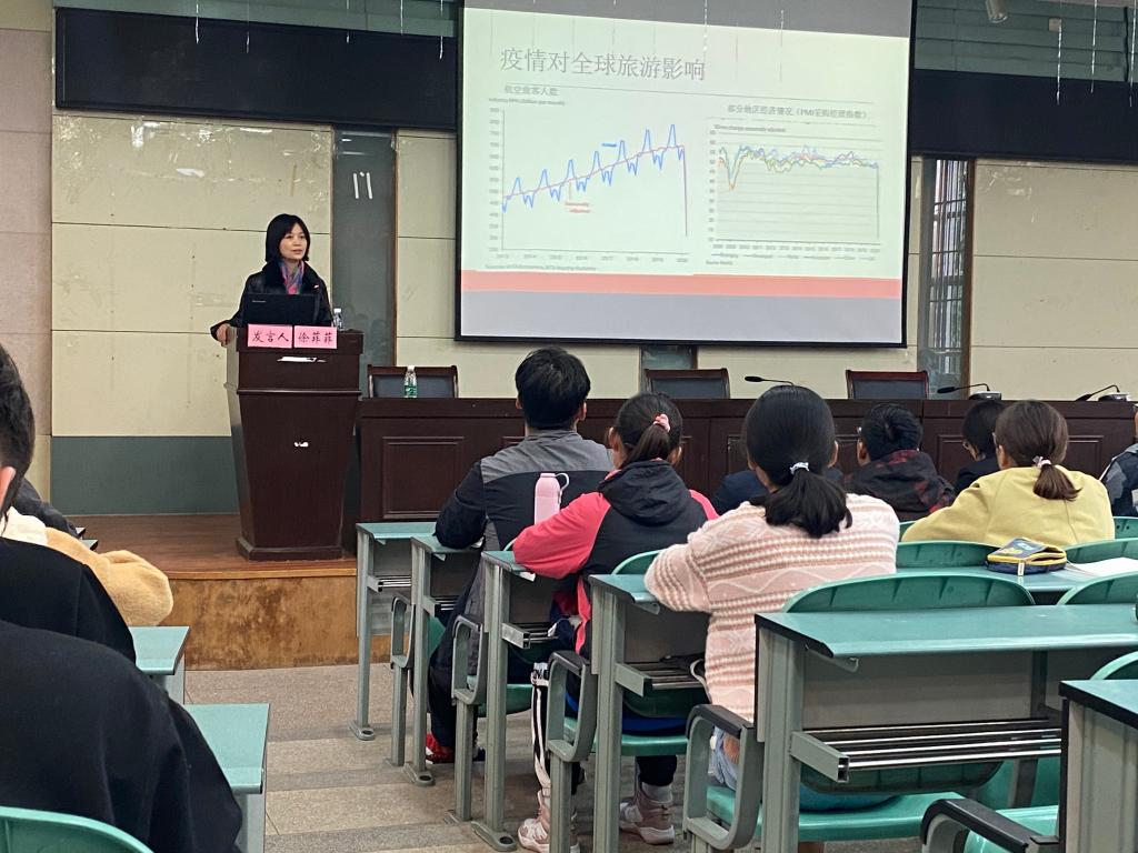 徐菲菲教授以“疫情对全球旅游业的影响”展开此话题,由浅入深,指出虽然2020年因为疫情旅游行业发展受到冲击,但不久旅游市场将会强劲复苏,并从“消费心理,消费体验,消费倾向新常态”四个方向分析后疫情时代的旅游特征。随后,徐菲菲教授从“美丽中国、绿水青山、文化自信”三个旅游视角方面指出旅游人家国情怀的内涵,并希望同学们争做新时代的旅游新青年。