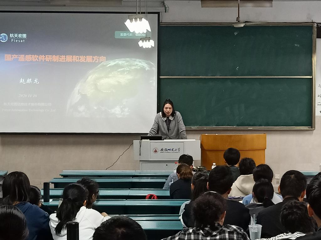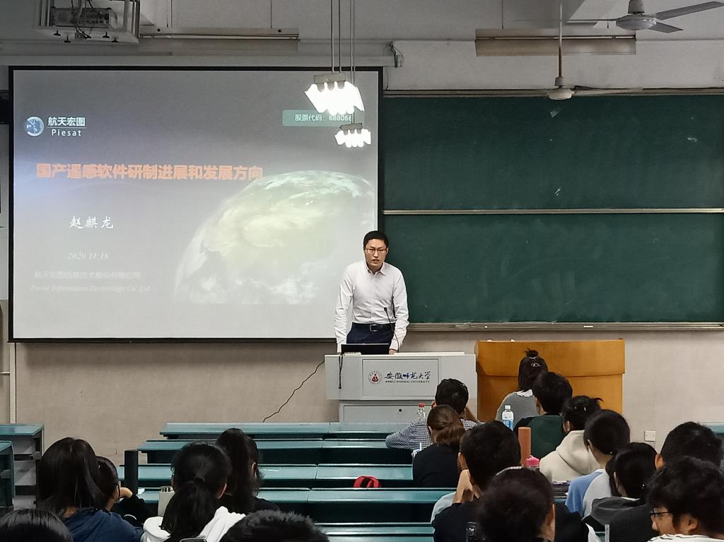 本网讯(英国365集团官网 孙雯杰 彭媛媛)为提高同学们对我国当前遥感软件的了解,培养同学们对遥感的兴趣,航天宏图研究院于11月18日下午2:00在行知楼2020302教室开展国产遥感软件研制进展与发展方向学术讲座。会议由英国365集团官网副教授齐凌艳主持,航天宏图研究院技术总监赵麒龙主讲,2018级地理信息科学专业以及2019级地理信息科学专业全体同学参与。