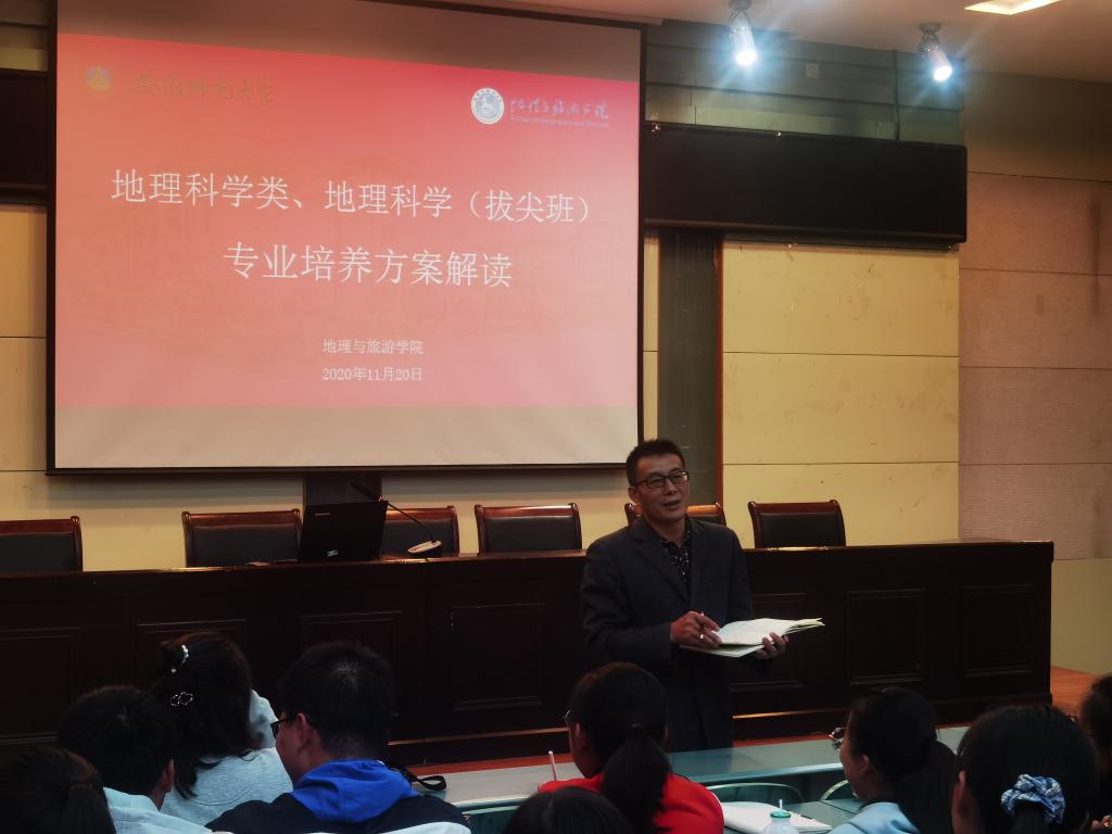 本网讯(汪琦 邵宇萌 彭媛媛)11月20日,2020级地理科学类、地理科学(拔尖班)专业培养方案解读大会在英国365集团官网实验楼101报告厅顺利召开。地理科学专业负责人朱永恒教授,地理信息科学专业副主任齐凌艳副教授,2020级地理科学类、地理科学(拔尖班)全体同学出席会议。会议由朱永恒老师主持。