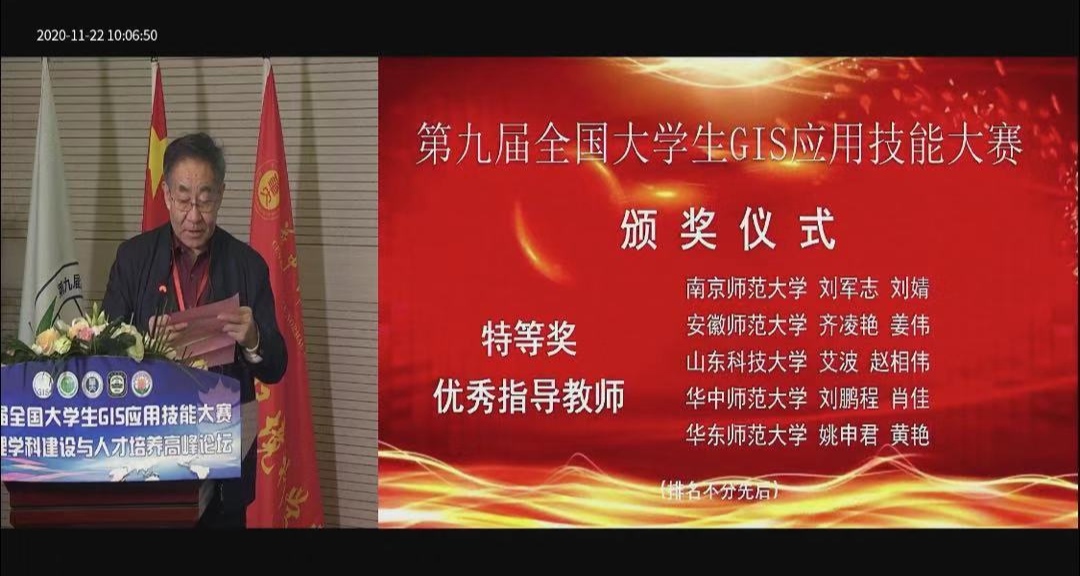 本网讯(英国365集团官网 孙雯杰 彭媛媛)2020年11月22日,由中国地理信息产业协会、中国地理学会主办的“第九届全国老员工GIS应用技能大赛”在华中师范大学落下帷幕,由公司英国365集团官网地理信息科学专业副主任齐凌艳副教授、青年教师姜伟博士指导,2018级地理信息科学专业员工丁雅欣、孙雯杰、张帅、翁泽锋组成的团队从来自全国151所高校的154支参赛队伍中脱颖而出,以总决赛排名全国第二的突出成绩荣获全国特等奖,取得了公司学子在该项赛事上的历史性突破,指导教师齐凌艳、姜伟获得大赛“特等奖优秀指导教师”荣誉称号。