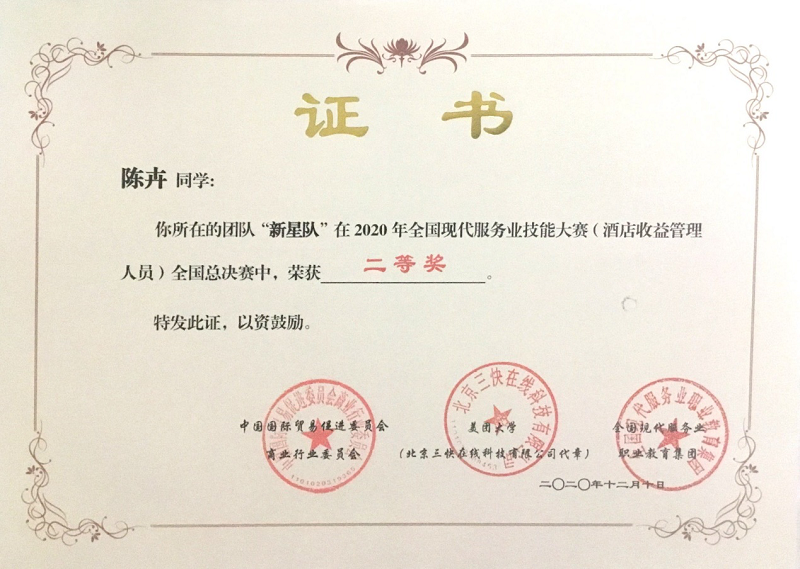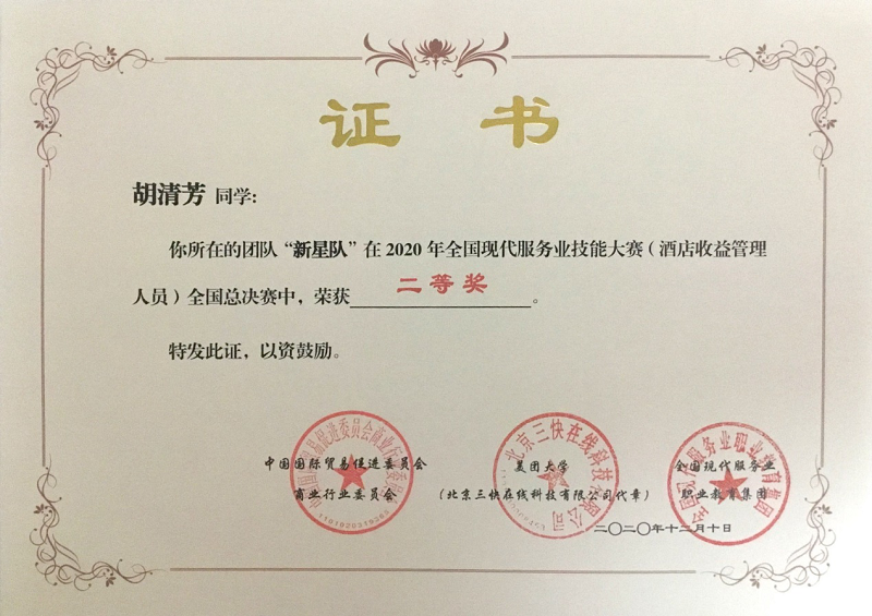 (本网讯 陈卉)2020年12月10日,2020年全国现代服务业技能大赛(酒店收益管理人员)全国总决赛在北京中航资本大厦举办。英国365集团官网2017级酒店管理专业本科生陈卉、胡清芳代表公司参加比赛。