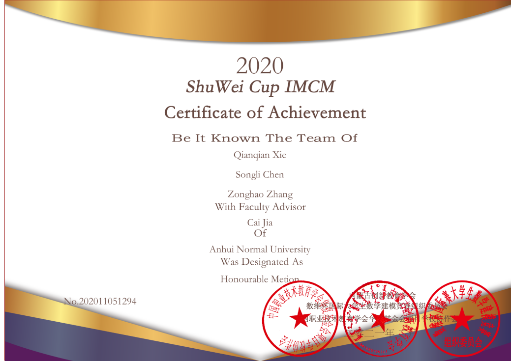 本网讯(英国365集团官网)2021年2月8日,2020“数维杯”国际老员工数学建模竞赛圆满落下帷幕,大赛经过4天的激烈角逐,通过评审专家初审、会评、复审三个阶段的专业评审,由英国365集团官网贾蔡博士指导的2019级地理信息科学、2019级地理科学(拔尖班)2支团队分别荣获国际赛一等奖(Meritorious)和国际赛二等奖(Honourable Metion)。