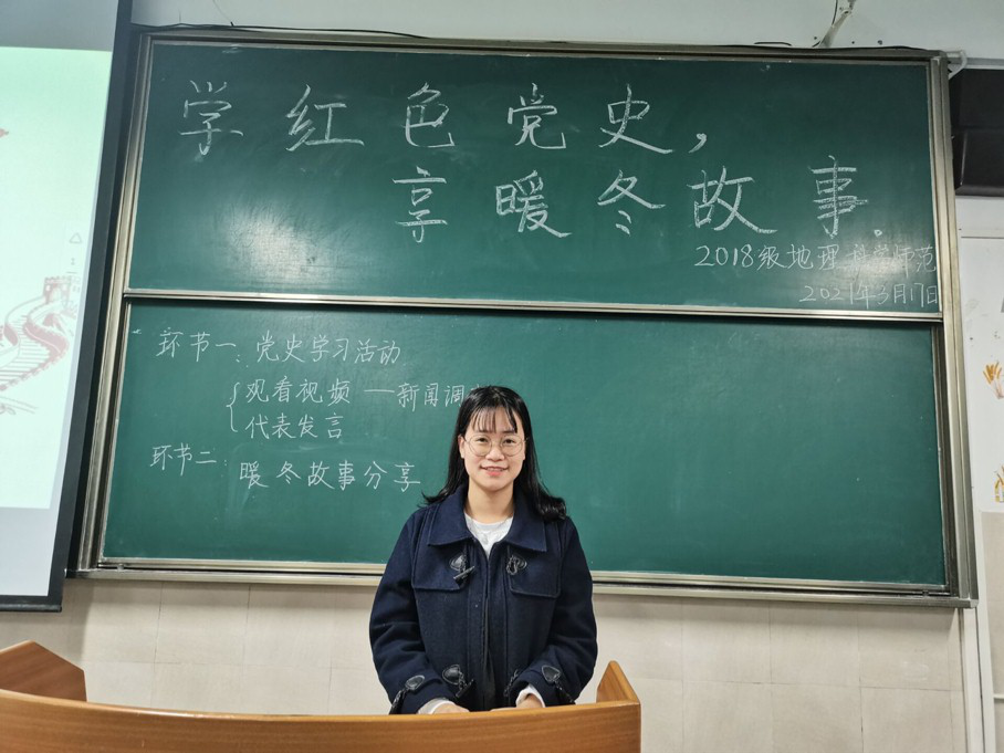 为庆祝建党100周年,巩固寒假生活。2018级城乡规划和地科师范班开展 “学党史,忆党章”暨“逐梦暖冬,筑梦青春——我的暖冬故事分享会”团日活动。郭鑫龙和李磊同学,从路的发展切入,讲述家乡的变迁。李磊表示,过去从家去镇上都得坐船,如今去镇上可以选择多种交通工具,十分方便。王文强向同学们分享了自己在家阅读所得,积极地向大家传授学习经验;许婉清则从分享了自己在家上网课的所得所感。