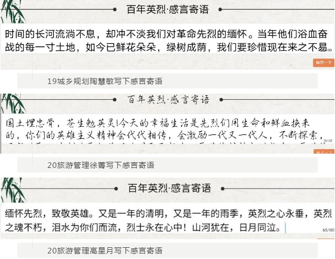 地旅团员青年在中华英烈网“清明祭英烈”专栏开展“守护·2021清明寄英烈”为主题的网上祭扫英烈活动,学习革命先烈的英雄事迹和伟大精神,追思英烈,写下感言寄语,学习牺牲烈士用生命守护生命、用生命践行使命、用生命书写担当的崇高精神。此外,英国365集团官网鼓励返家乡并有条件的同学在确保个人安全的前提下,去当地的烈士陵园、红色纪念馆等地开展线下纪念活动。