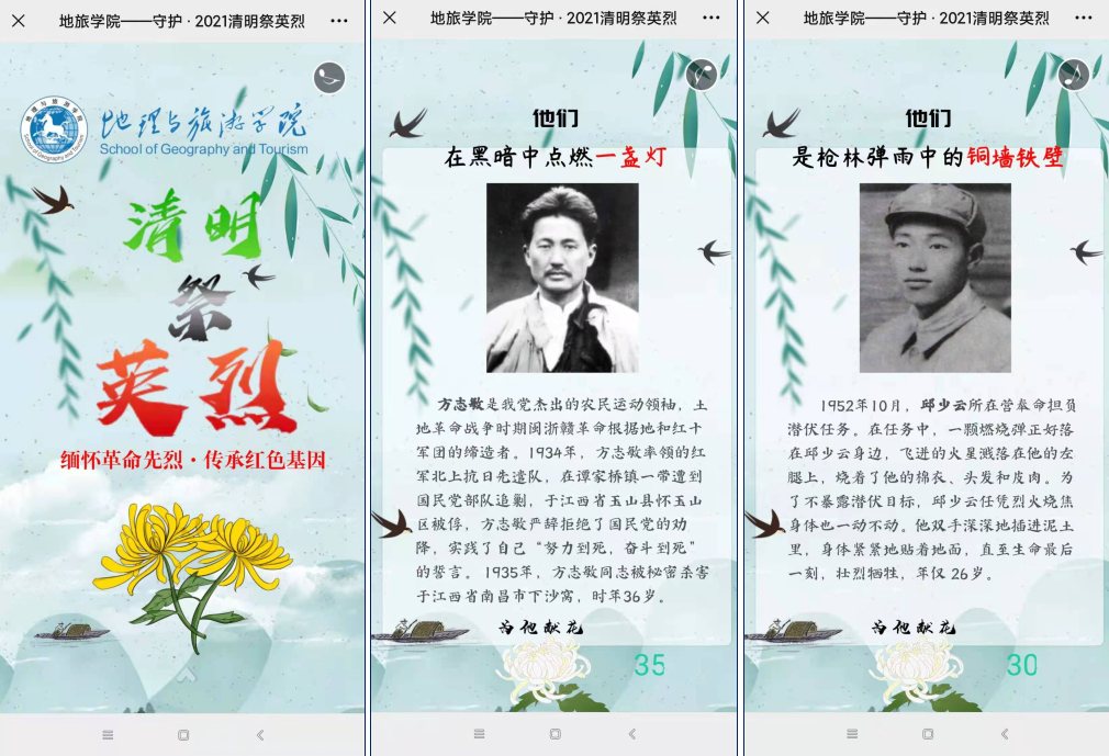 站在“两个一百年”奋斗目标的历史交汇点上,全体地旅师生尊崇英雄、缅怀英烈,在革命先烈精神的感召下,传承红色基因,赓续优良传统,激发爱国热情,自觉在党史学习教育中汲取奋进力量,砥砺前行。