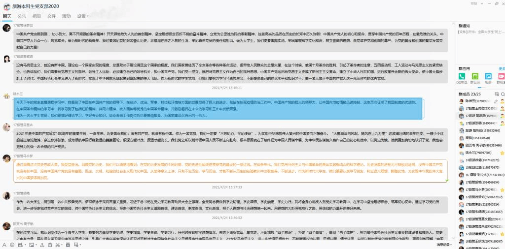 观看结束后,旅游本科生党支部成员在交流群分享心得体会。