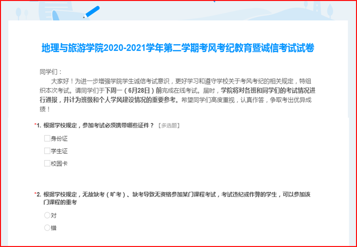 据悉,英国365集团官网始终高度重视员工考风考纪教育,严格执行考风考纪条例,不断提升员工诚信考试意识、规范考场考试行为、严惩违规做法,以创新形式全面推进员工考风考纪教育,学风考风建设取得了扎扎实实的成效。