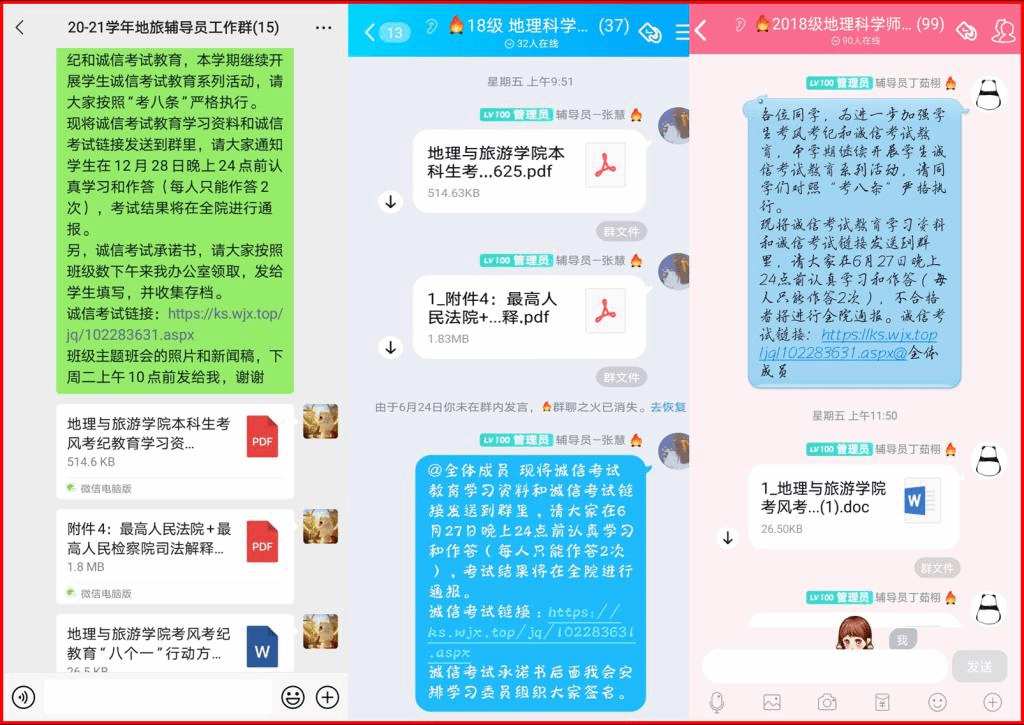 进行在线宣传,营造良好氛围。为进一步推进员工考风考纪教育,公司各年级专业辅导员通过QQ、微信等网络新媒体,开展线上专题教育,切实把考风考纪工作抓在手上,落到实处,提高了同学们的思想认识,端正了考试态度,营造了诚信考试、诚实做人的氛围。