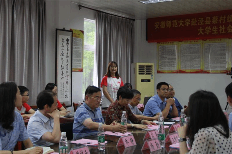 揭牌仪式结束后,张素兰代表泾县人民政府讲话,她首先对彭凤莲副董事长一行的到来表示热烈欢迎,并以“一面旗、一首诗、一幅画、一张纸、一条路”这“五个一”重点介绍了泾县旅游资源的基本情况。讲话中,她表达了自己对师大实践团队师生冒着高温酷暑、为当地乡村旅游发展提供理论依据的实践行动表示感动;对师大师生长期以来关注当地旅游业发展,主动提供人才、智力支持表示感谢,同时希望进一步强化校地合作,欢迎师大师生能够在未来的实践工作中继续关心支持泾县经济社会发展,为泾县旅游发展提供更多可实践、可操作的指导路径和政策建议。