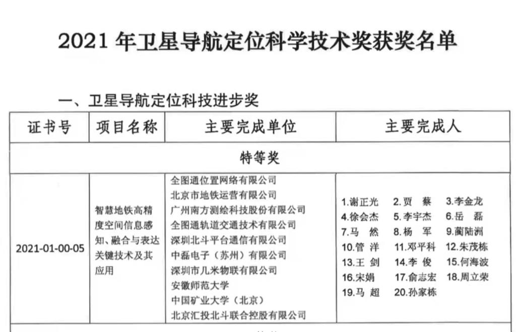 评选会议由中国科公司院士杨元喜主持,评审委员会委员由中国工程院院士谭树森、国际欧亚科公司院士党亚民等国内知名专家组成。经过评审委员会评审和奖励委员会批准,并经过社会公示,最终由公司青年教师贾蔡作为技术负责的项目“智慧地铁高精度空间信息感知、融合与表达关键技术及其应用”荣获特等奖!