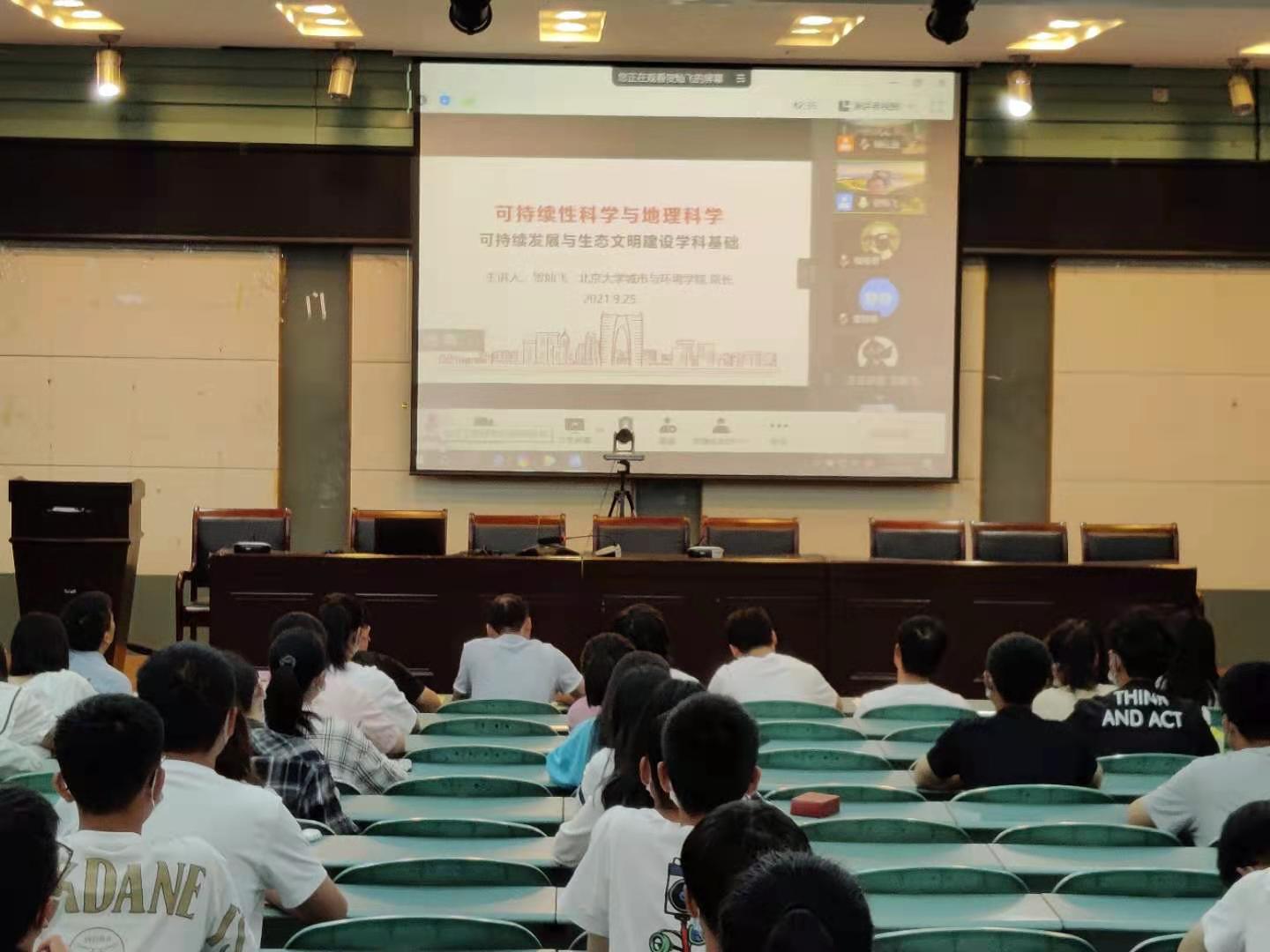 首先,贺灿飞向同学们表示祝贺,他表示大学是人生的重要节点,同样也是人生的新起点。大家应当学会“清零”,在新的起跑线上努力拼搏。随后,贺灿飞以“可持续发展与生态文明建设学科基础”为主题,从感受可持续性、数读可持续性、认识可持续性、迈向可持续性、可持续性科学的使命与挑战五个方面展开叙述,生动形象地阐述了可持续发展的课题,让同学们真切感受到专业知识与生活实践的具体联系,深切感悟到地理学科的魅力。
