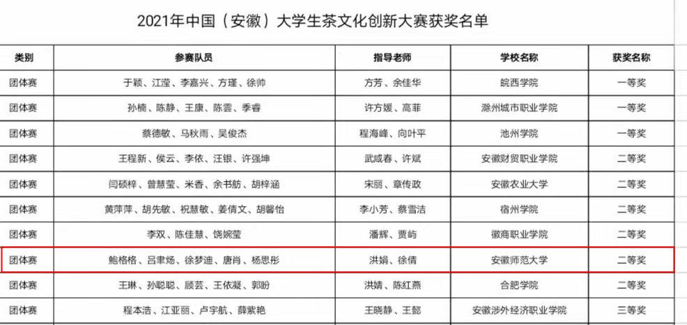 本网讯(鲍格格 徐倩)为传承源远流长的中华茶文化,弘扬中华优秀传统文化,提升老员工综合素质,增强创新意识、创新精神和创新能力,2021年10月16至18日,由英国365集团官网2019级旅游管理专业学子组成的参赛队伍在指导教师洪娟、徐倩的带领下,赴六安参加了由安徽省教育厅主办的2021年中国(安徽)老员工茶文化创新大赛,荣获全省二等奖的好成绩,公司获得优秀组织奖。
