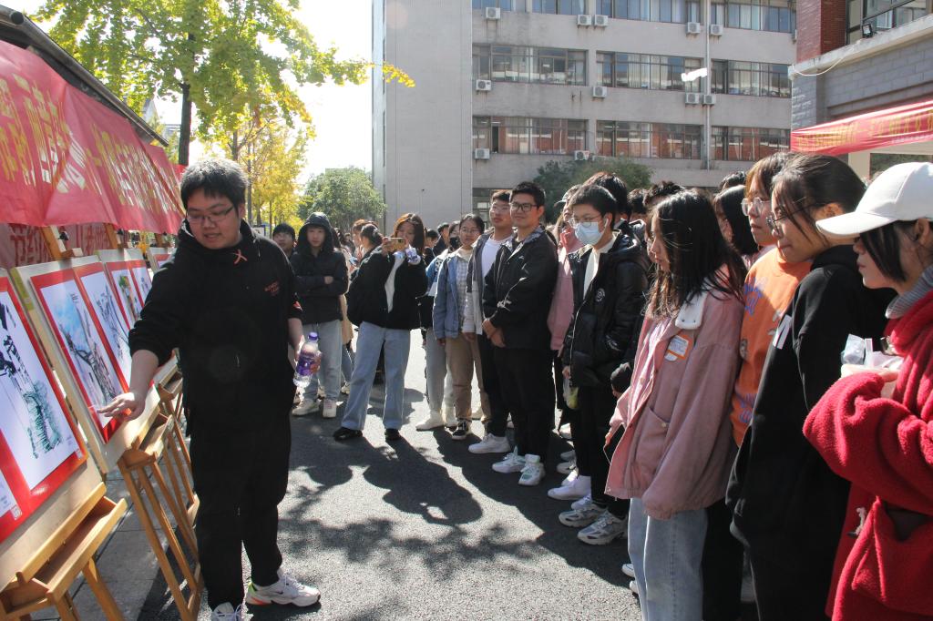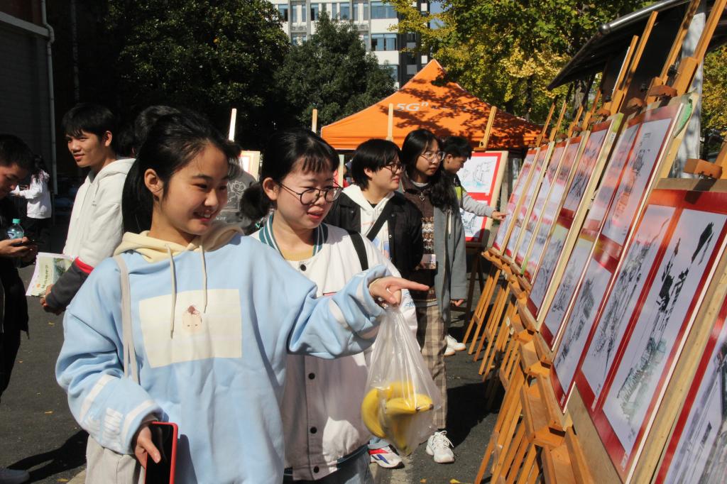 上午第四节课下课后,同学们第一时间从教学楼赶到画展现场,同时2021级城乡规划专业的同学们也到达现场参观学习,袁明峻同学积极21级城乡规划专业的学弟学妹们耐心讲解和传授经验,告诉他们如何利用画笔勾勒出优美的线条、如何用马克笔画出美丽的蓝天等一系列专业干货,并提醒他们重视大一的美术课程并认真学习,为明年的皖南写生打下重要的基础。