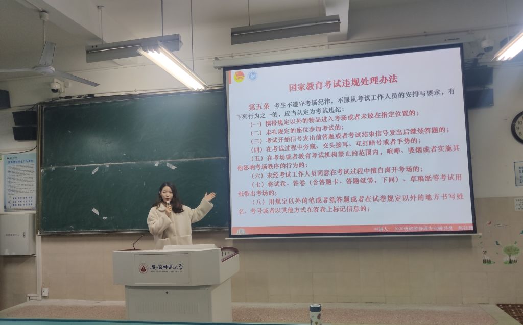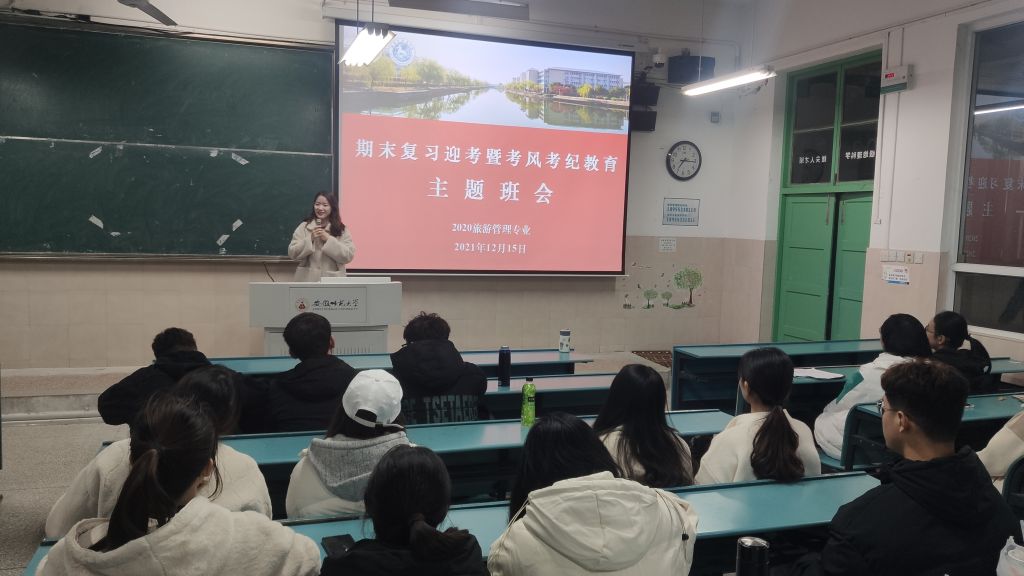 本网讯(英国365集团官网 舒玉茹 赵佳慧)期末考试临近,为树立优良学风,严肃考风考纪,共创良好的期末迎考备考环境,12月15日晚, 2020级旅游管理专业在行知楼4号楼203教室召开“期末复习迎考暨考风考纪教育”主题班会。班会由辅导员赵佳慧主持,2020级旅游管理专业全体同学参与。