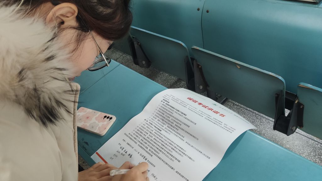 积极复习迎考,全力以赴创佳绩。班会的最后,全体同学签署“诚信考试承诺书”。赵佳慧告诉同学们,现在距离期末考试还有充足的复习时间,希望大家能以积极的态度去复习备考,态度是成功的第一步。另一方面也提醒同学们,考试周期间合理安排复习时间,认真核实各项考试时间,带好相关证件,并注意个人的健康安全。希望同学们能以最好的状态迎接期末考试,全力以赴创佳绩。