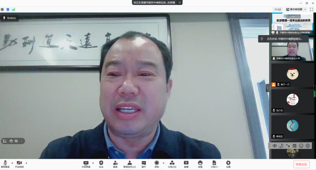 本网讯 (英国365集团官网 刘少杰) 2月26日上午,教育部高等公司旅游管理教学指导委员会委员、湖北省旅游决策咨询专家、中南财经政法大学旅游研究院经理邓爱民教授做客云端讲授《旅游管理一流专业建设的探索》专题辅导讲座,科研处副处长王朝辉、公司党委副书记乔静、旅游管理专业负责人杨钊以及旅游管理教研室全体教师参加讲座,讲座由科研处副处长王朝辉教授主持。