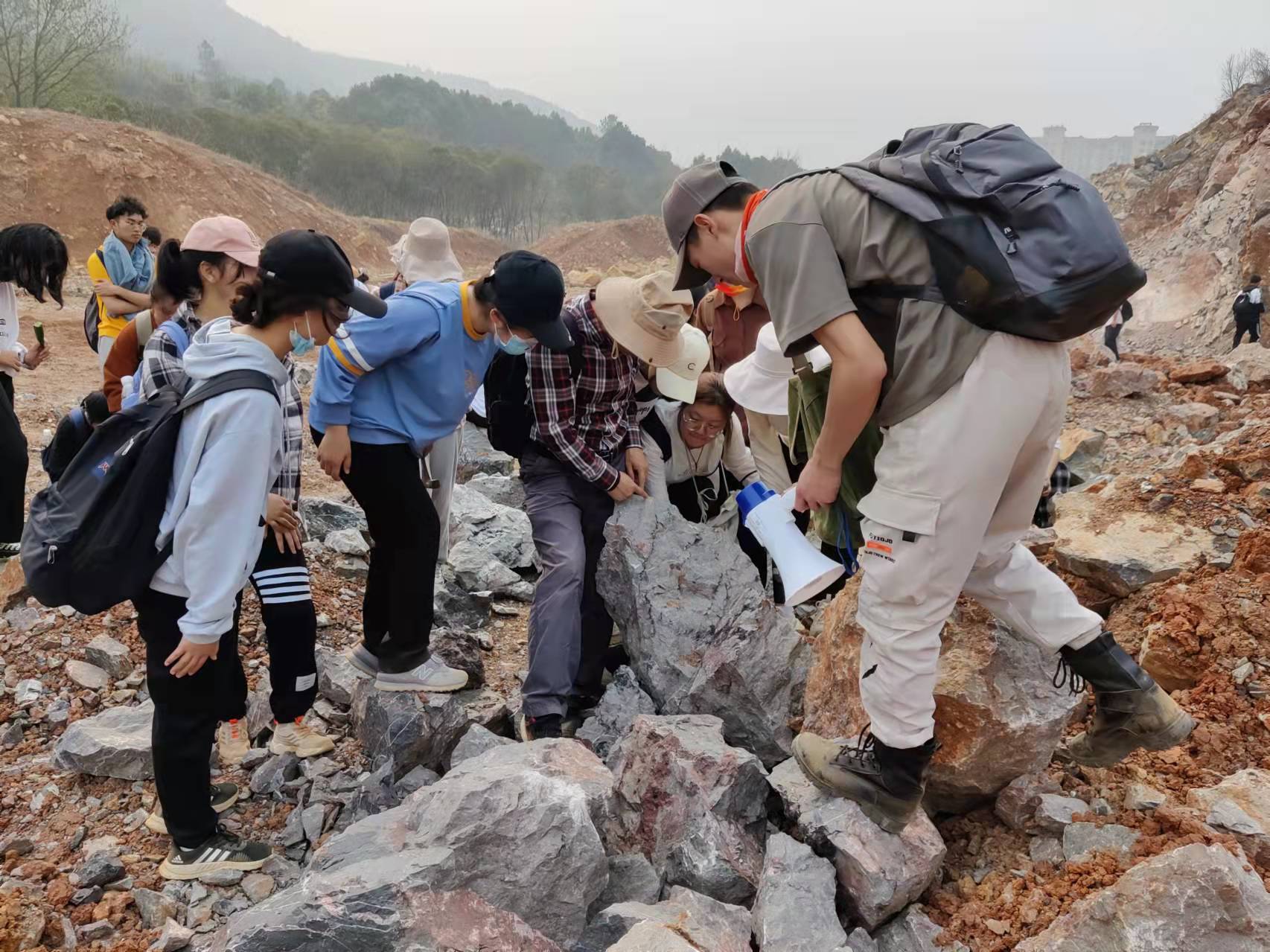 地质罗盘,指引地旅学子的求知之路;磐磐巨岩,化作同学们向上的阶梯。同学们抓住这次出野外的宝贵机会认真学习,狮子冲口的背斜成谷、平顶山的向斜成山,同学们使用罗盘测量产状,让书本上的知识在实践中得到验证。幸福泉边,同学们用手轻触泉水,深呼泉水的清澈沁凉;紫微洞中,同学们坐船同游地下暗河,惊叹于大自然的鬼斧神工;177高地前,程先富老师带领同学们探索栖霞组、船山组、黄龙组、和州组的岩性特征,细细体会这亿万年间的沧海桑田;鹅头岩下,杨立辉老师带领同学们分析断层地貌及其判断标志。
