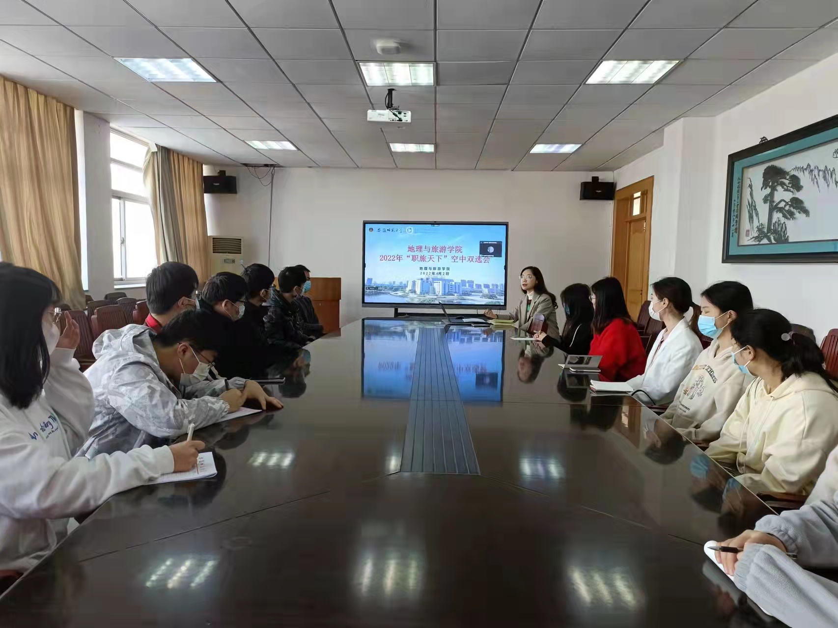 本次空中双选会分为文旅类专场和综合类专场两场,根据毕业生专业需求有针对性地分类开展。准备阶段,公司发布线上专场招聘会企业邀请函,并通过专业教师推荐、员工意向调查等方式,邀请、遴选员工们真正感兴趣的、与专业对口的优质企业参会宣讲。毕业班辅导员提前指导员工完善简历,并统一组织简历投递,落实好过程化服务。