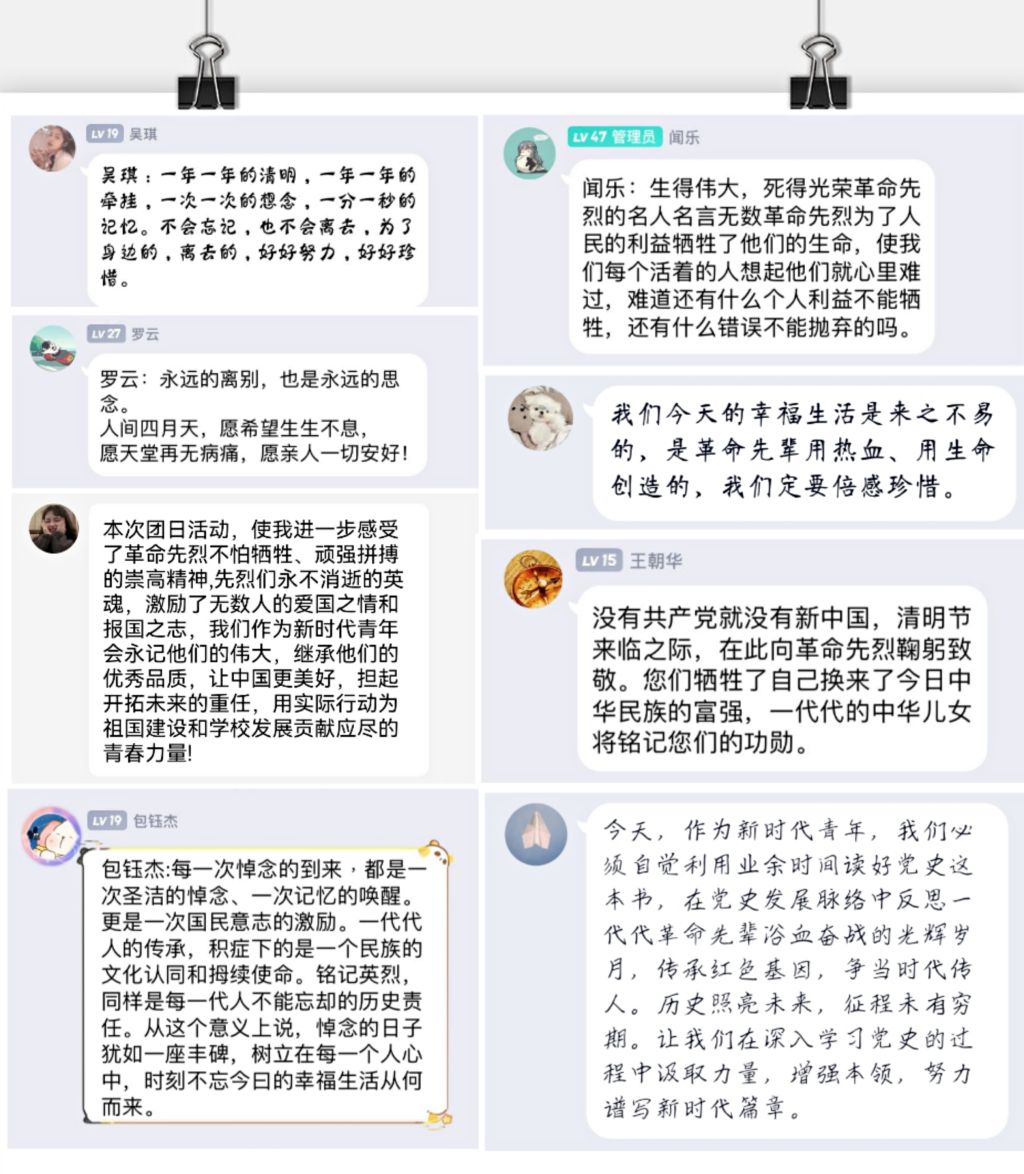 公司各班级围绕“清明祭英烈”和“学习党的青年运动史”两大主题,通过主题班会、草地研讨、湖畔演讲、读书分享等形式积极开展相关活动。通过交流分享英烈可歌可泣的感人事迹,同学们进一步了解了他们光辉和伟大的一生,感受到了他们用生命守护生命、用生命践行使命、用生命书写担当的崇高精神和不惧艰辛、一心为国的革命情怀。