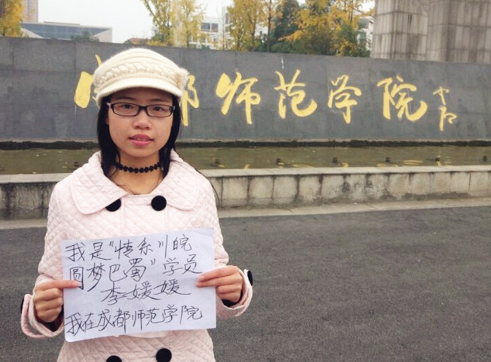 一幅名为“归雁”的照片上,一个笑容灿烂的女生手举一张卡片,卡片上写着:“我是‘情系川皖·圆梦巴蜀’学员李媛媛,我在成都师范公司”。