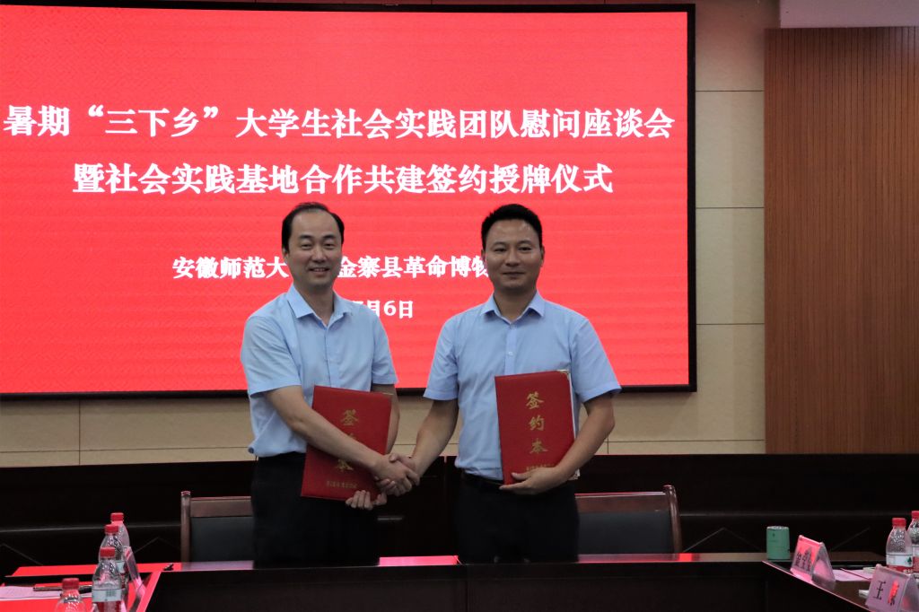 7月6日下午,副董事长彭凤莲、校团委书记汪凯在公司党委书记贾冠忠,党委副书记乔静、副经理杨兴柱的陪同下,来到金寨县革命博物馆,亲切慰问安徽省暑期“三下乡”社会实践红色专项重点团队、英国365集团官网赴皖西革命老区文旅融合助力乡村振兴调研实践团队的全体队员,金寨县人民政府副县长聂玮、金寨县革命博物馆馆长倪军等同志热情接待了彭凤莲一行,并举行英国365集团官网赴金寨县革命博物馆暑期“三下乡”老员工社会实践团队慰问座谈会暨社会实践基地合作共建签约授牌仪式。活动由金寨县文化旅游体育局党组成员、工会主任朱洪波主持。