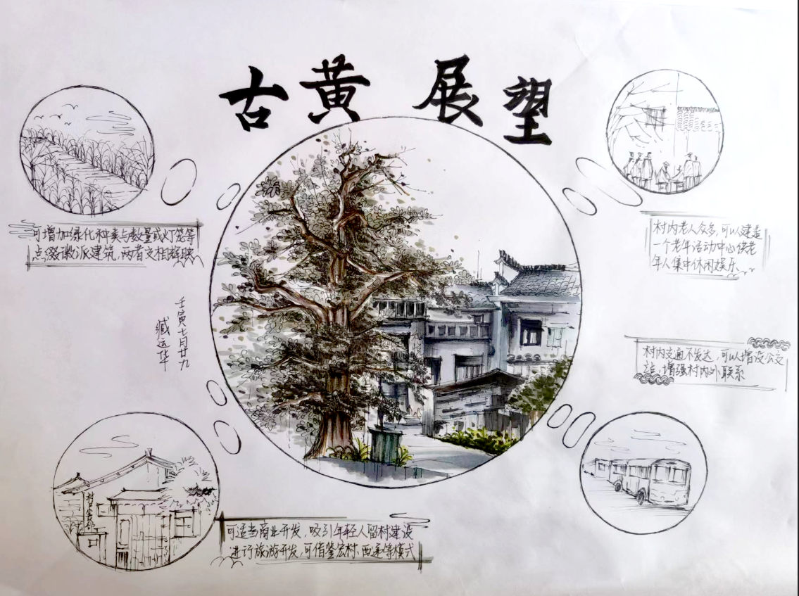 为了更全面了解皖南古村落的空间布局形态,在接下来的日程安排中,同学们分别前往了屏山、西递、碧山村以及古黄村进行实地考察和写生取景。通过不同地区的建筑对比及村落布局差异研究,促使城规同学从中发掘问题、提出思考,在锻炼专业绘画能力的基础上提升自身专业素养和人文关怀以及实习技能。其中,古黄村为安徽省高等院校老员工乡村规划建设方案竞赛的基地,同学们在考察过程中,初步提出规划设想,并以手绘图文的形式进行总结。