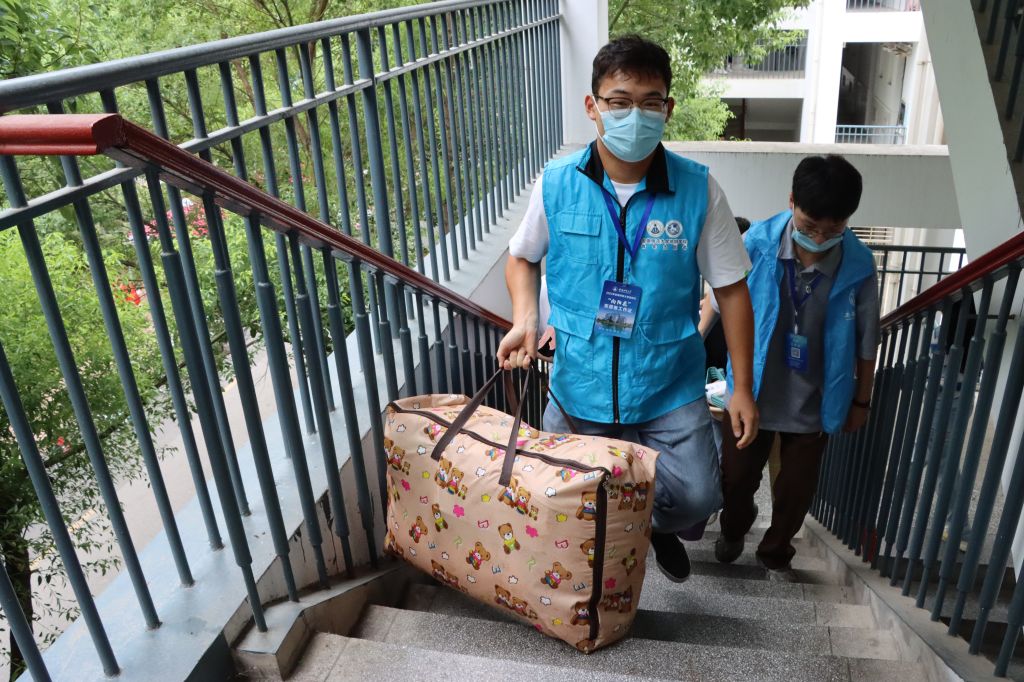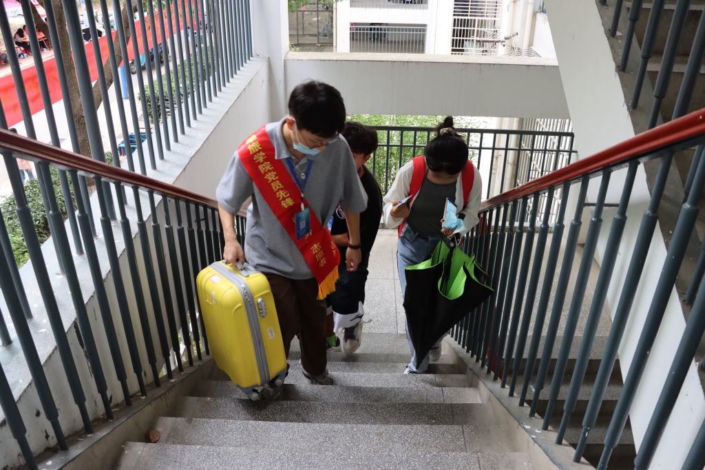 报到当天,冒着淅淅沥沥的小雨,志愿者们早早来到迎新现场进行准备,志愿者们热情洋溢、怀揣爱心,为2022级新生提供最温暖的服务。一个个蓝色的身影奔走于报名点和寝室之间,引导新生报道、搬运行李、为新生指路等,绘就出一幅幅青春洋溢的画面。志愿者用真诚的微笑、热情的服务带给每一位新生归属感,努力减轻他们进入新环境的陌生感。新生在志愿者的耐心指引下依次有序地完成报道流程。整个报到现场井然有序,确保了人员不聚集、排队有秩序、报到高效率。