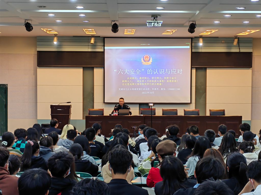 会上,朱滦河以“‘六大安全’的认识与应对”为题,分别从“网络安全”“政治安全”“消防安全”“交通安全”“治安安全”“防诈骗安全”等六个方面,为同学们详细讲解了身边常见的安全类型,现场演示了灭火器使用、防侵害自我保护等技能,并重点讲解了当前电信网络诈骗面临的新形势新特点。他指出,电信网络诈骗是当前发生率比较高的非接触性诈骗案件,具有作案流程错综复杂、骗术花样繁多、手法翻新快等特点,呈产业化发展、企业化运作,多为跨区、跨境作案,侦破难度大。他还举例说明了电信网络诈骗的常见类型,特别提醒同学们注意近期新出现的“闲鱼”“表白墙”等网络诈骗,强调凡是涉及资金交易和网络兼职,一定要进行核实,时刻绷紧防范意识这根弦,做到不轻信、不透露、不转账,以实际行动守护个人生命财产安全,筑牢国家安全屏障。