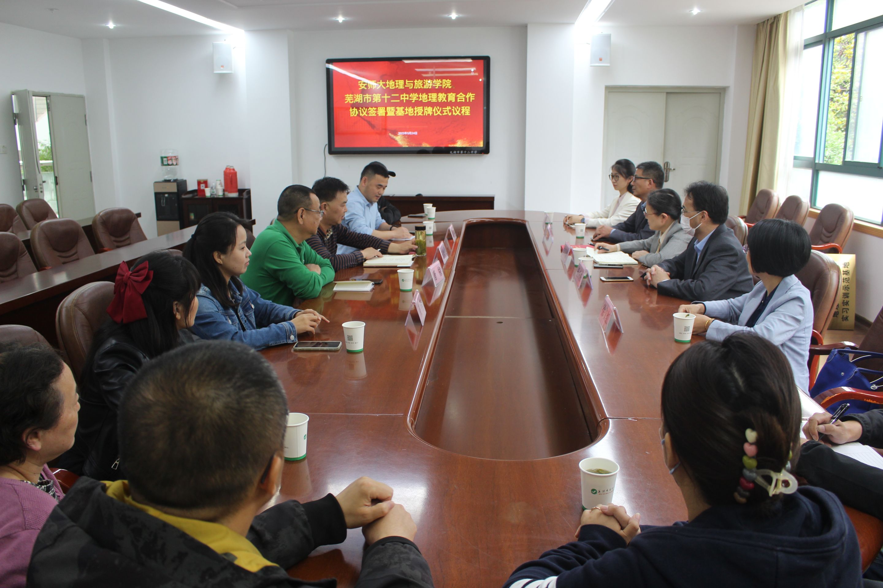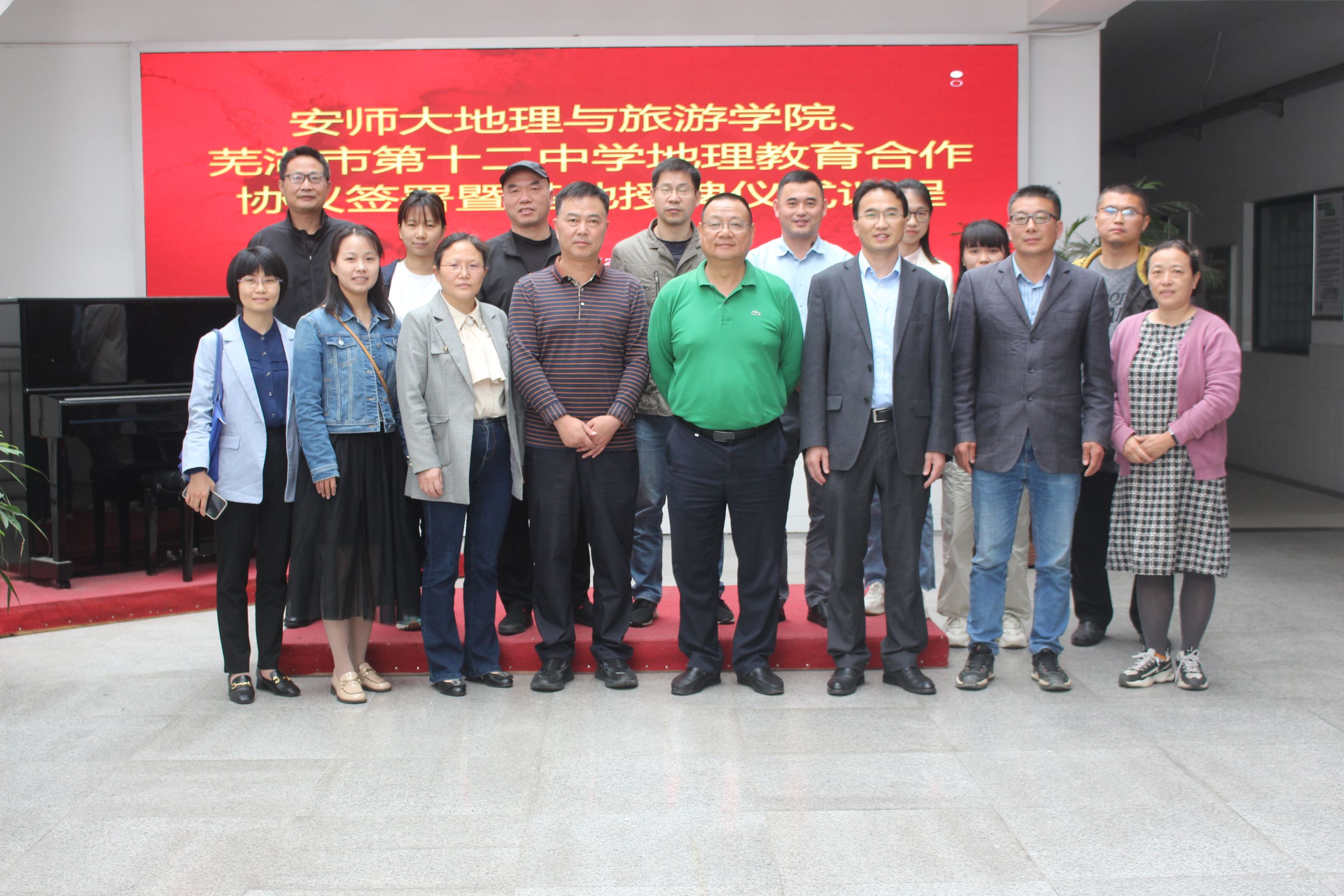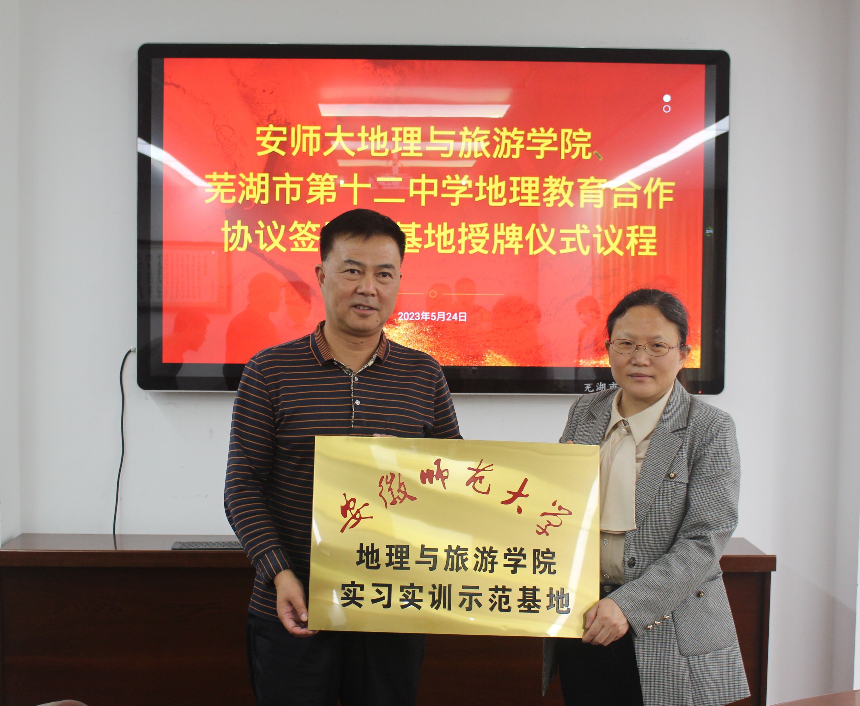 为加强公司地理学科师范生实习实训基地建设,5月24日下午,公司经理方凤满教授、副经理杨兴柱教授、地理科学专业负责人朱永恒教授、徐仪红教授、辅导员操晶晶一行赴芜湖市第十二中学就共建地理学科师范生实习实训示范基地、加强师范生培养等事项进行交流探讨,并举行实习实训示范基地授牌仪式。芜湖市第十二中学董事长查海曼、副董事长唐棣、教务处副主任刘峰、地理教研组组长张燕、教师马其虎、王小倩等出席,仪式由刘峰主持。